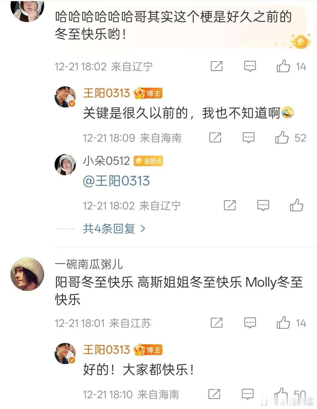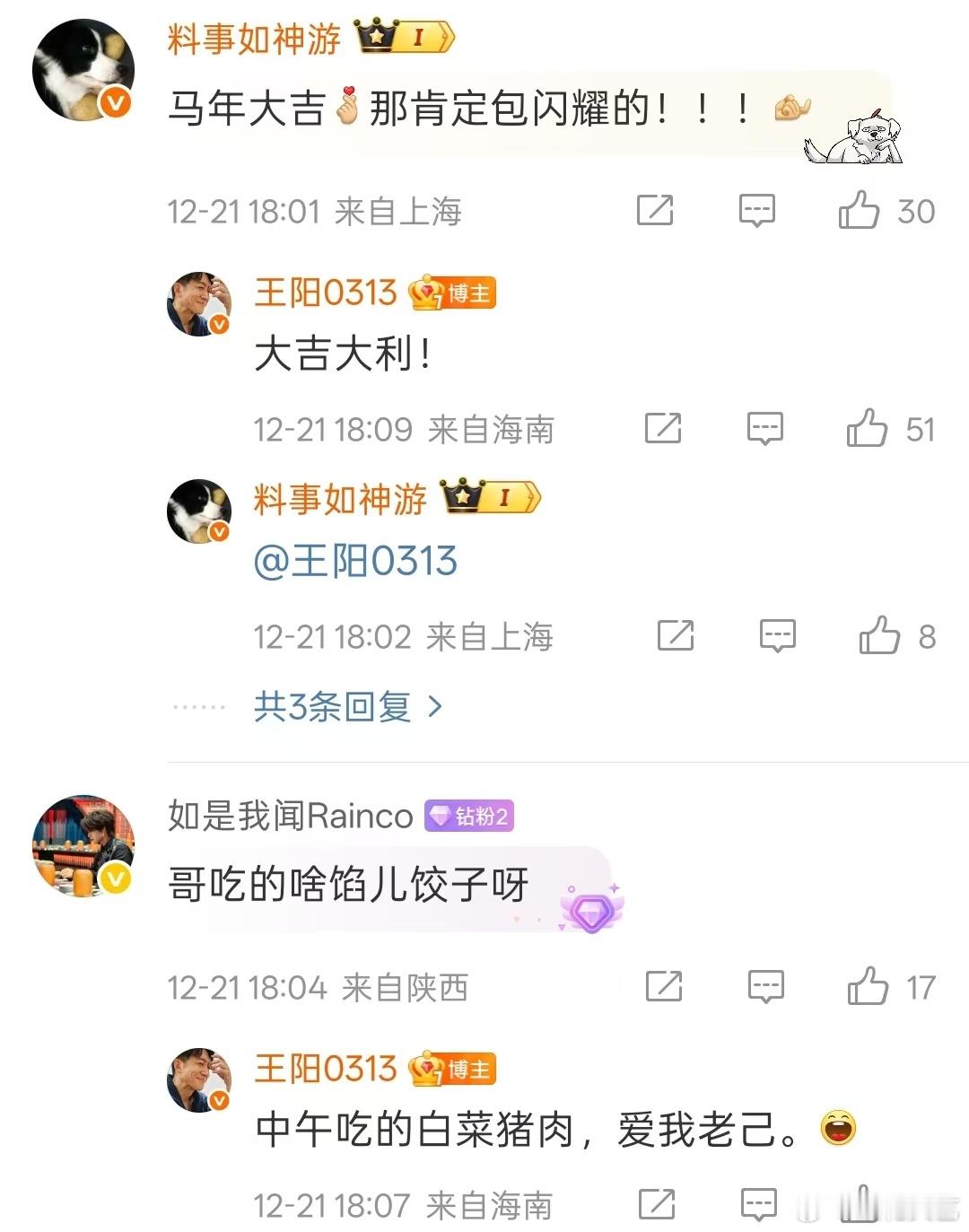 王阳在星光大赏学到真东西了 叔也是冲上8G网络了,网友问王阳中午吃啥,王阳回应“中午吃的白菜猪肉,爱我老己”,还跟鹅友爱互动上了!