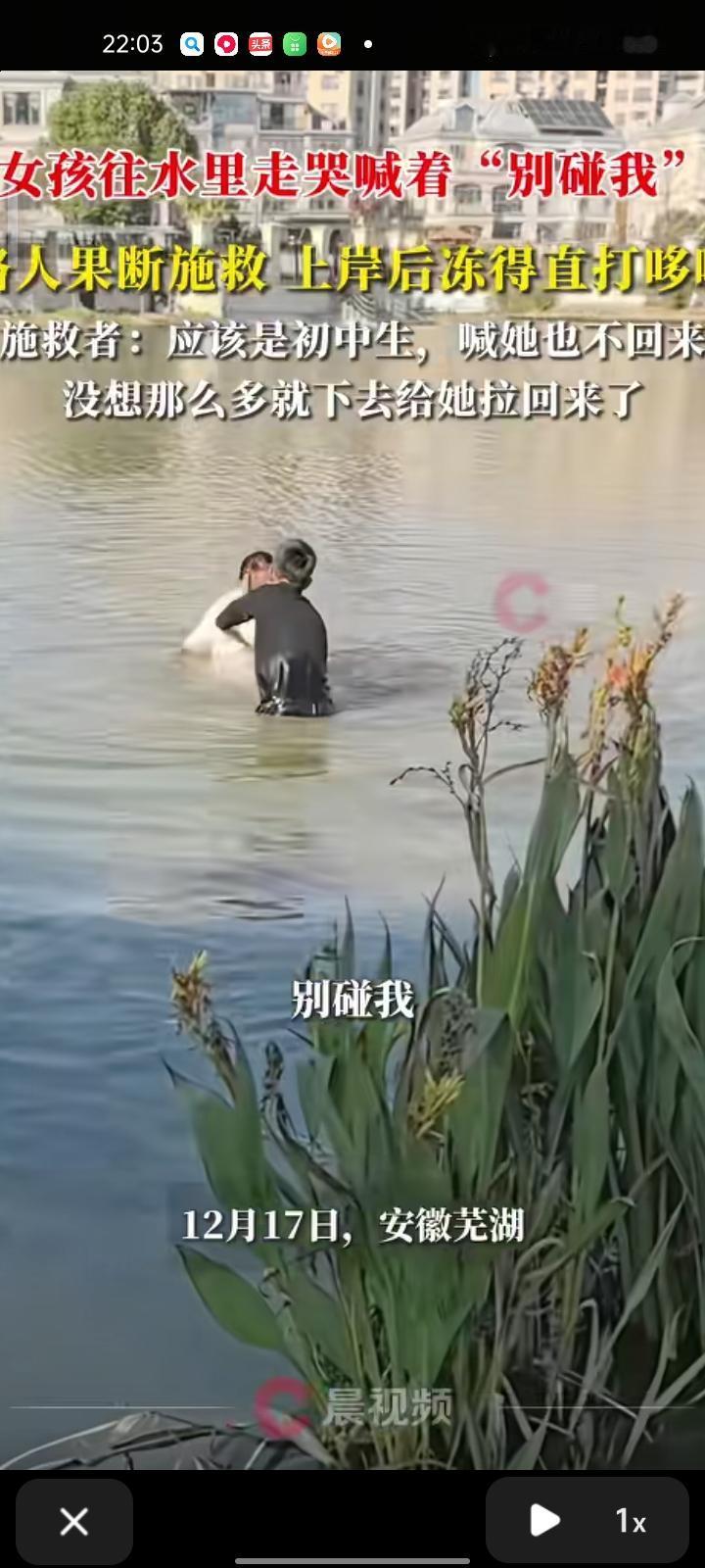 12月17日,安徽芜湖。女孩往水里走哭喊着“别碰我”,黑衣男子果断施救,上岸后冻得直哆嗦。 救人者王先生称,女孩应该是初中生,自己想轻生就往水里跑,旁边有很多人喊她,她也不回来。当时没想那么多,感觉不对劲就下去把她拉回来了。事后,把女孩交给警察后就离开了。 希望民警、家长的努力劝说下,让女孩走出轻生的念头,因为生命只有一次啊,离开了就无法复生。