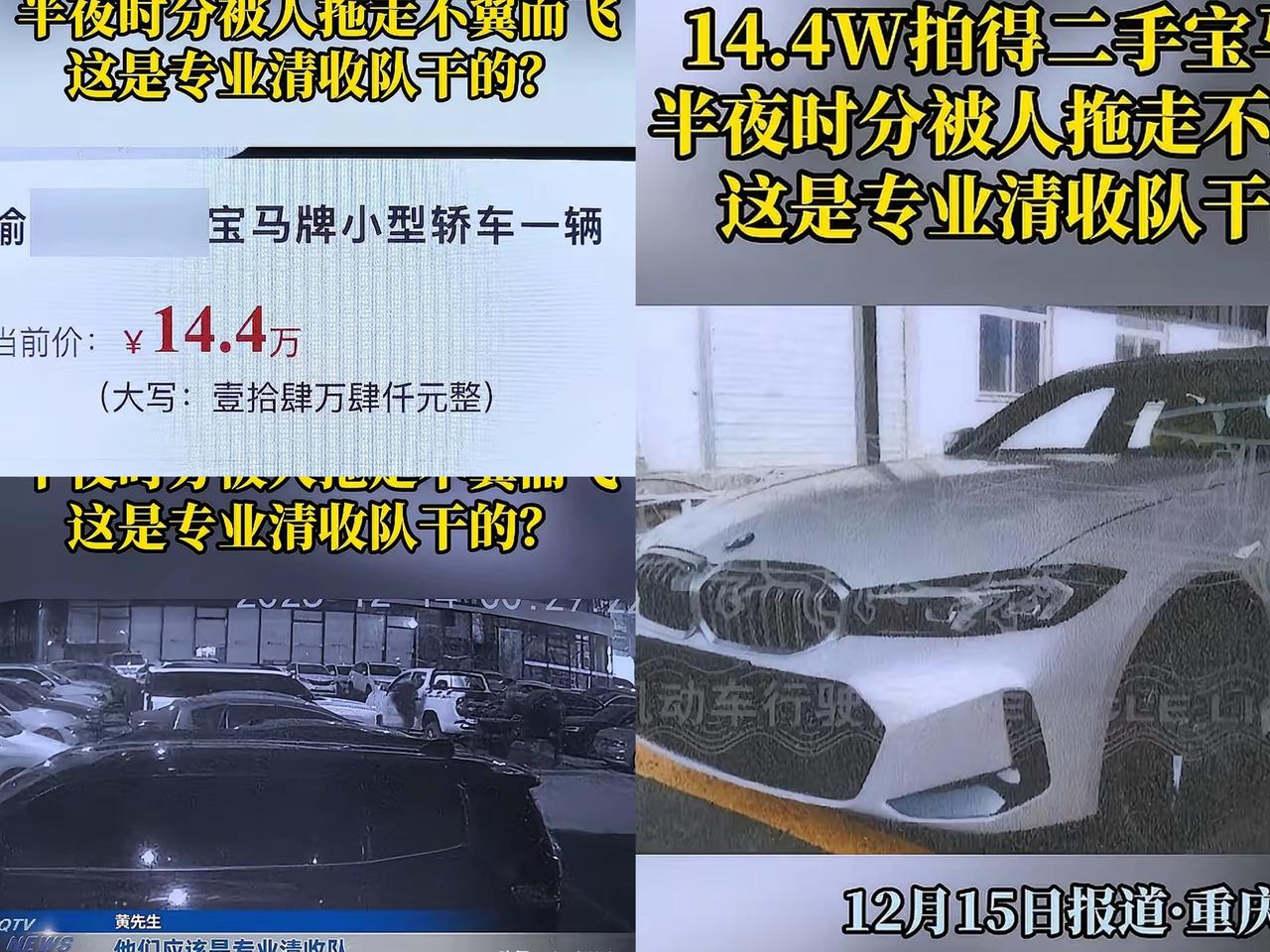 亏大发了!”重庆,一男子在法院竞拍下,花14.4万经拍下一辆2023年的宝马320。谁知,车子到手后,还没等顺利过户呢,车子 就在停车场不翼而飞。男子调取监控发现,4个陌生人开来一辆皮卡,将自己的车子拖走了。男子怀疑原车主有外债,肯定知道实情。 于是,找到原车主询问情况,可原车主一口咬定,这事和他无关。男子只能报警,目前,警方已经介入。 黄先生开了一家二手车行,10月底刷到法院拍卖信息时别提多心动了,2023年的宝马320,起拍价才14.4万,转手就能赚一笔。 他果断参与竞拍,顺利拿下后,11月中旬就拿到了法院的执行裁定书和协助执行通知书,紧接着喊板车把没钥匙的宝马拖回了自己的车行。 接下来十几天,他忙着联系4S店配钥匙、跑各种过户手续,满心期待早点把车子过户到自己名下。 12月13日,他带着所有资料冲去车管所,早就打听好要走补行驶证、办理解押、申领免检标志、处理违章、过户这五个流程。 可车管所排队的人实在太多,忙前忙后办完前两个流程就到了下班时间,剩下的只能等周一再办。 黄先生把车停在二手车行的地下停车场,想着周末休息两天,没想到周日回去一看,车子居然不翼而飞了! 调取监控后,黄先生惊出一身冷汗:一辆无牌皮卡开进停车场,四个陌生人几分钟就把宝马拖上架子,动作干脆利落,一看就是“专业操作”。 结合车子的来历,他立马怀疑是原车主有外债,把已经不属于自己的车又拿去抵债了。 可联系原车主时,对方一口咬定没外债、不知情;找法院,法院也说原车主当初明确声明过没有外债,对拖车一事毫不知情。 拿着合法的法院裁定书,车子却被人明目张胆拖走,黄先生别提多憋屈了,赶紧报警求助,目前警方还在调查中。 很多人可能会问,没过户的车子,真的属于黄先生吗?答案是肯定的!黄先生拿到法院裁定书的那一刻,这辆宝马就已经是他的合法财产了。 那些私自拖车的人,行为已经构成盗窃罪。《刑法》第264条规定,以非法占有为目的盗窃公私财物,数额较大就够得上刑事处罚。 而这辆14.4万的宝马,早就远超“数额较大”的标准。要是原车主真的是主谋,明知车子已经判给黄先生,还找人拖车抵债,那就是典型的盗窃故意,必然要承担刑事责任。 至于那四个动手的人,如果真不知情,只是被原车主蒙骗,主观上没有非法占有的想法,大概率是被当枪使了,不会同罪论处,但也得为自己的行为承担相应责任。 黄先生的遭遇,其实暴露了法院拍卖资产的一个隐形风险:原车主可能隐瞒债务纠纷,导致竞拍者后续遭遇麻烦。 最高法相关案例也明确过,出售或拍卖无处置权的车辆,相关人员要承担法律责任,可现实中,竞拍者往往要付出大量时间和精力维权。 这事儿也给所有想参与法院拍卖的人提了个醒:低价背后可能藏着坑,竞拍前一定要查清楚资产是否有隐性债务、纠纷,竞拍后尽快办完所有过户手续,别给不法分子可乘之机。 同时,法院在拍卖前也该更细致地核实资产情况,避免类似的纠纷发生。 更关键的是,合法权益受侵害时,一定要像黄先生这样及时报警、用法律武器维权。 那些觉得“没过户就不算你的”“拖走也没办法”的想法,只会纵容不法分子的嚣张气焰。 法律从来都是站在合法所有者这边的,只要证据确凿,就别怕维权麻烦。 14.4万对普通人来说不是小数目,眼看要过年了,黄先生的车子还没找到,换谁都得着急。但相信警方一定会查明真相,帮他追回财产,也让背后搞鬼的人付出应有的代价。 你有没有参与过法院拍卖?或者遇到过类似的财产纠纷?面对这种“合法拍下却被抢”的情况,你觉得还有哪些维权办法?