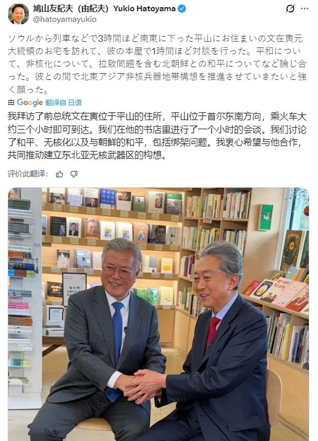 日本前首相鸠山由纪夫去拜访韩国前总统文在寅了 鸠山由纪夫拜访完文在寅之后,还在自己的社交平台发文说:我衷心希望与他合作,共同推动建立东北亚无核武器区的构想。 据悉,日本前首相鸠山由纪夫是在12月19日去拜访的文在寅,当时现场有很多媒体和记者,当鸠山由纪夫去抵达的时候,文在寅和他边走边聊,两人在文在寅书房内聊了差不多一个小时,可以说这两位前总统都是非常爱好和平,主张温和外交,是很多人都喜欢的前总统。如今鸠山由纪夫也已经快要80岁了,还在操心国家大事,当高市早苗说出错误的言论后,鸠山由纪夫也出面批评高市早苗了。这次他来和文在寅会谈,谈论的主要也是共同推动建立东北亚无核武器区的构想。 虽然两人都在为和平尽力,可是现在的总统也很难听他们的道理了。文在寅退休后很少参与韩国的事情了,自己退休后还开一家书店,没事的时候,和夫人种点蔬菜,也经常被网友偶遇。