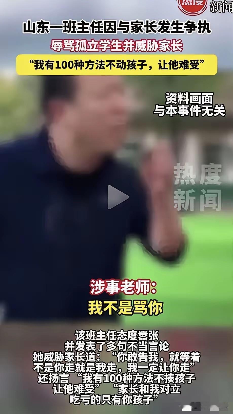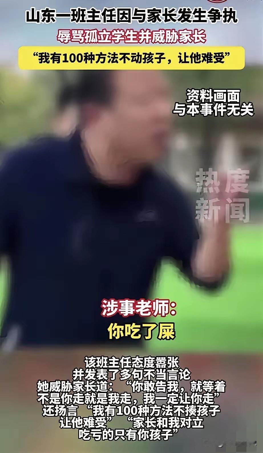 谁给你的 权 利?山东,一家长和老师发生争执,谁知班主任辱 骂孩子: 狗尾巴草就是狗尾巴草,永远变不成花,她又辱 骂家长: 我不是骂你,你就是吃了屎,这不是骂人,这是形容,我有100种方法不动孩子,让他难受,家长和我对立,吃亏的只有你的孩子……警方已经介入调查。 山东街头巷尾最近都在热议一件事,一位家长和班主任的争执,愣是撕开了家校矛盾里最让人膈应的一面。 谁能想到,站在讲台上教书育人的老师,能对着孩子说出那样扎心的话,还敢明目张胆威胁家长,这番操作直接让全网炸开了锅,警方也已经介入调查。 这事说起来不算多大的起因,无非就是家校之间的一点小分歧。家长和班主任因为孩子的教育问题起了争执,本来坐下来好好沟通就能解决的事,谁知道这位班主任的火气一下子就上来了,言语间满是刻薄和不屑。 她先是把矛头对准了无辜的孩子,张口就说“狗尾巴草就是狗尾巴草,永远变不成花”,轻飘飘一句话,像一把刀子扎在孩子心上,全然不顾这话会给孩子的自尊心带来多大的伤害。 面对家长的质问,这位老师非但没有半分收敛,反而变本加厉。她对着家长恶语相向,说出的话不堪入耳,甚至还强词夺理,声称那些难听的话不是骂人,只是“形容”。 更让人脊背发凉的是,她还放出狠话,直言自己有100种方法,不用动孩子一根手指头,就能让孩子在学校里过得难受。她还明晃晃地警告家长,要是敢和自己对着干,最后吃亏的肯定是孩子。 这些带着侮辱和威胁的话,被家长完整记录了下来,传到网上后瞬间点燃了大家的怒火。谁都有孩子,谁都盼着孩子在学校能被老师温柔以待,可这位老师的所作所为,完全背离了为人师表的底线。 网友们纷纷炸锅,有人说这哪里是老师,分明是拿着教育的幌子欺负人;有人心疼那个被骂成“狗尾巴草”的孩子,不知道这番话会在他心里留下多大的阴影。 大家最气愤的,是这位老师嘴里那句“100种方法让孩子难受”。这话里藏着的霸权和冷漠,比任何辱骂都让人寒心。 学校本应该是孩子最安全的港湾,老师本应该是孩子最信任的人,可在这位老师眼里,教书育人的岗位,竟然成了拿捏孩子、威胁家长的筹码。 很快,这件事就闹到了警方那里。调查的消息一出来,所有人都在等着一个说法。 毕竟,教育不是老师的一言堂,更不是谁手里可以肆意挥舞的权力棒。每一个孩子都是独一无二的,哪怕他暂时不够优秀,也不该被贴上“狗尾巴草”的标签,更不该成为老师泄愤或者立威的工具。 这些年,家校矛盾的新闻时不时就会冒出来,可像这样直白又嚣张的辱骂和威胁,还是让人觉得格外刺眼。 大家之所以这么关注这件事,不只是为了替这位家长和孩子抱不平,更是想讨个公道——教育的底线到底在哪里?老师的权力边界又该划在何处? 要知道,孩子的心灵是最脆弱的,一句鼓励的话能照亮他很久,一句贬低的话也可能毁掉他的自信。 老师这个职业,从来都不只是传授知识那么简单,更肩负着塑造孩子品格、呵护孩子心灵的责任。可这位老师的所作所为,显然早就把这份责任抛到了九霄云外。 目前,警方的调查还在继续,所有人都在等着一个公正的结果。大家希望这件事能给所有老师敲响警钟,也希望能让更多人明白,家校之间的沟通,从来都该建立在尊重的基础上,而不是靠着威胁和辱骂压人。 对此,你们有什么看法,欢迎评论留言~
