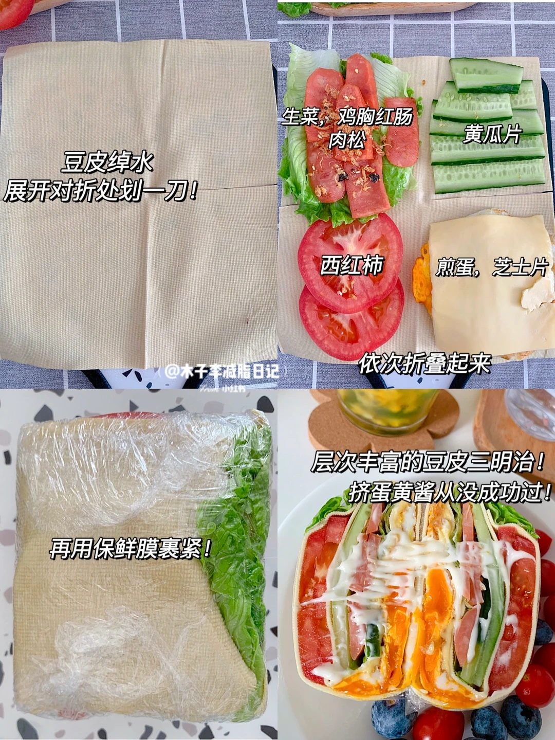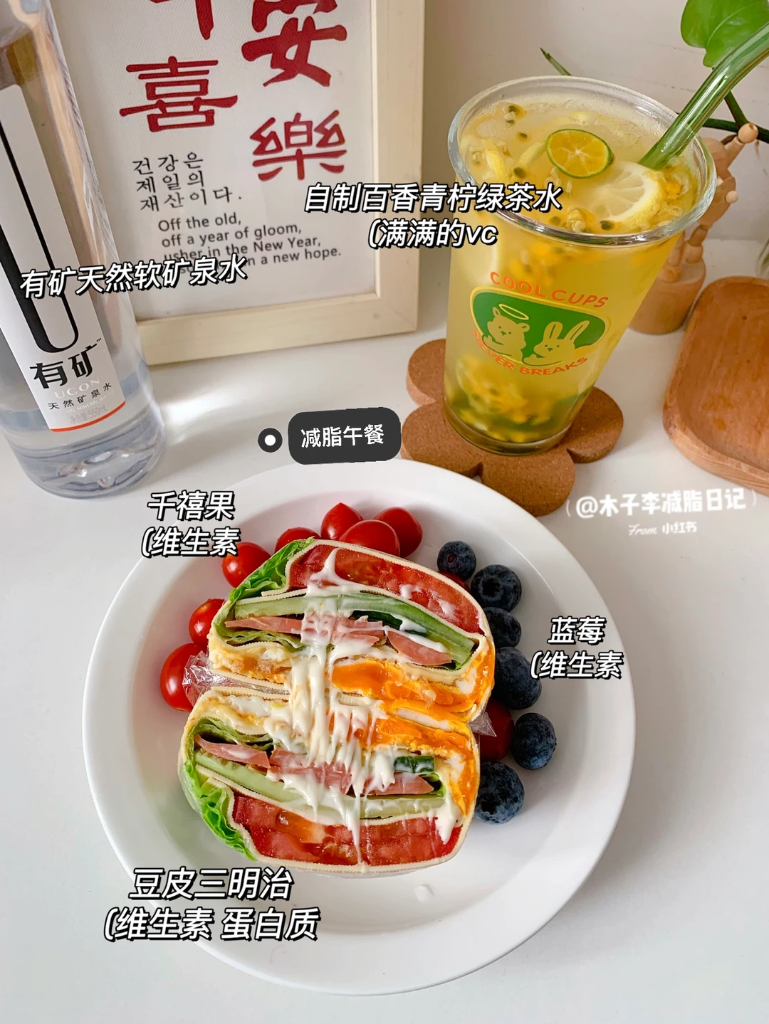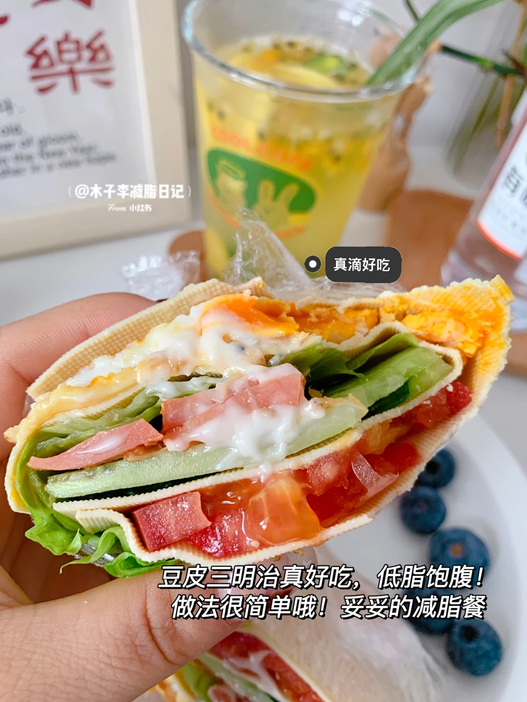 🥙午餐:豆皮三明治➕自制百香柠檬绿茶➕千禧果➕蓝莓