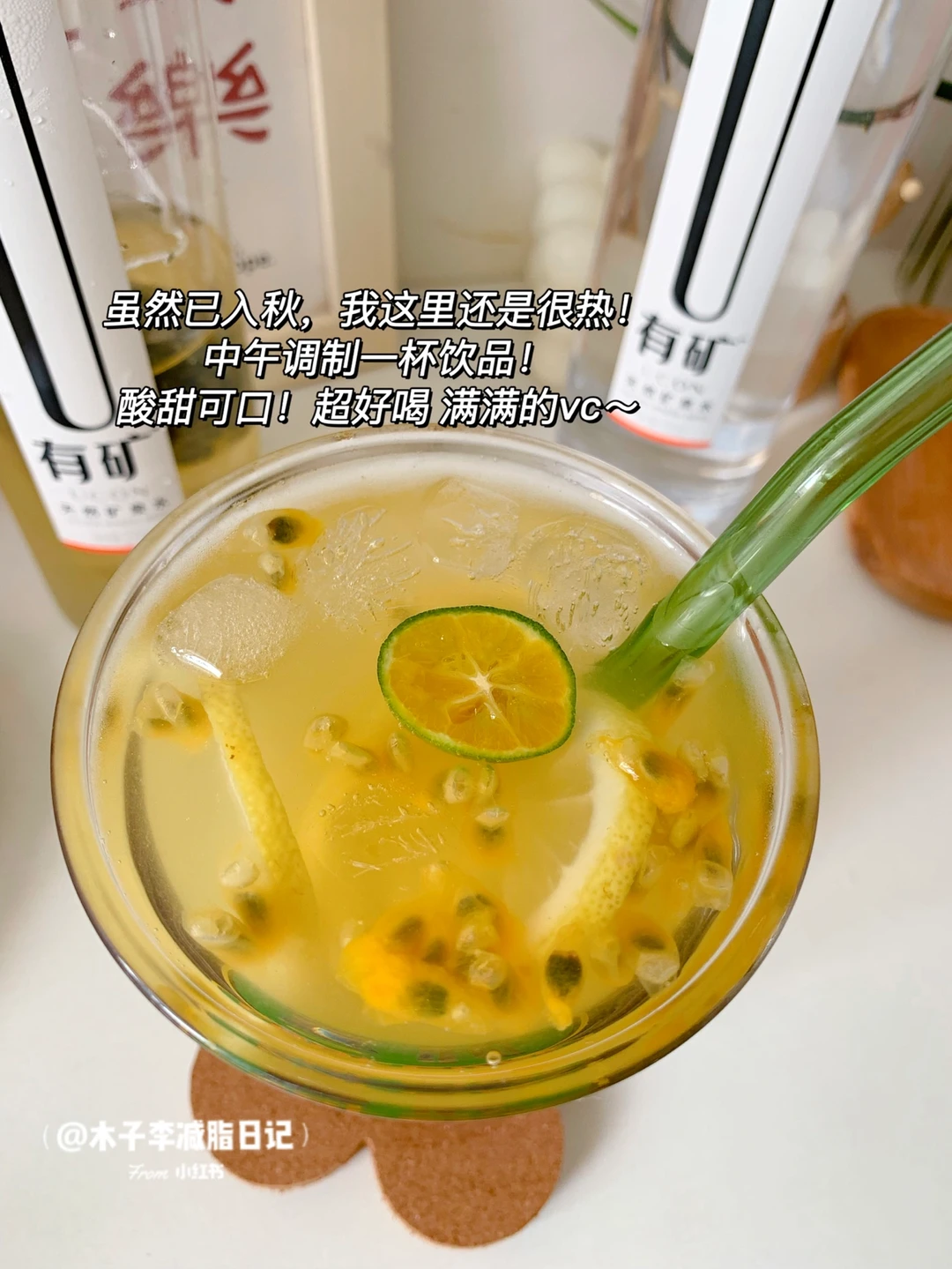 📣:虽然已入秋可我这里还是很热,秋天要多补水润燥,刚好家里有百香果柠檬这些!就用矿泉水给自己来个冷泡百香柠檬绿茶🍵~酸甜冰爽 满满的vc