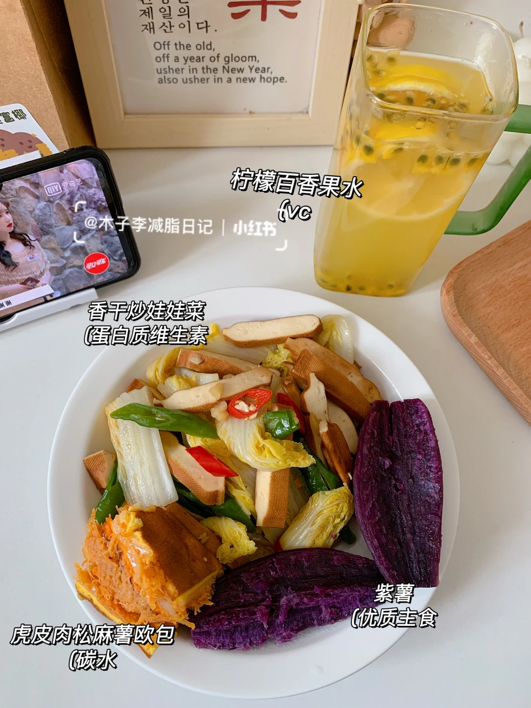 🥙午餐:香干炒娃娃菜➕紫薯➕麻薯肉松虎皮➕百香柠檬水