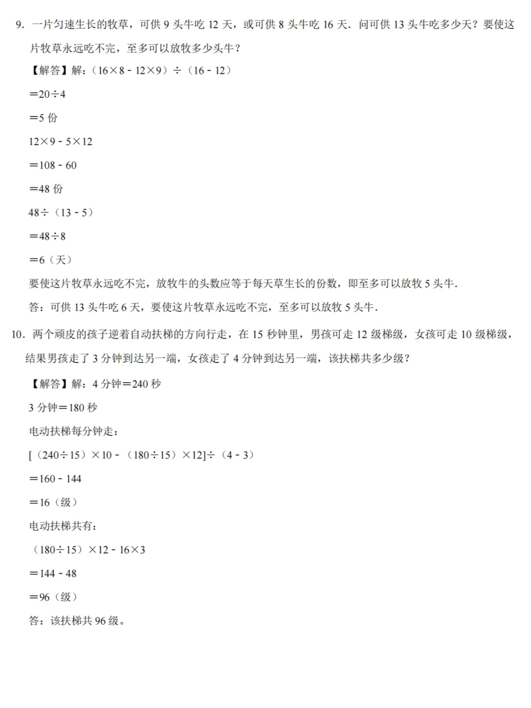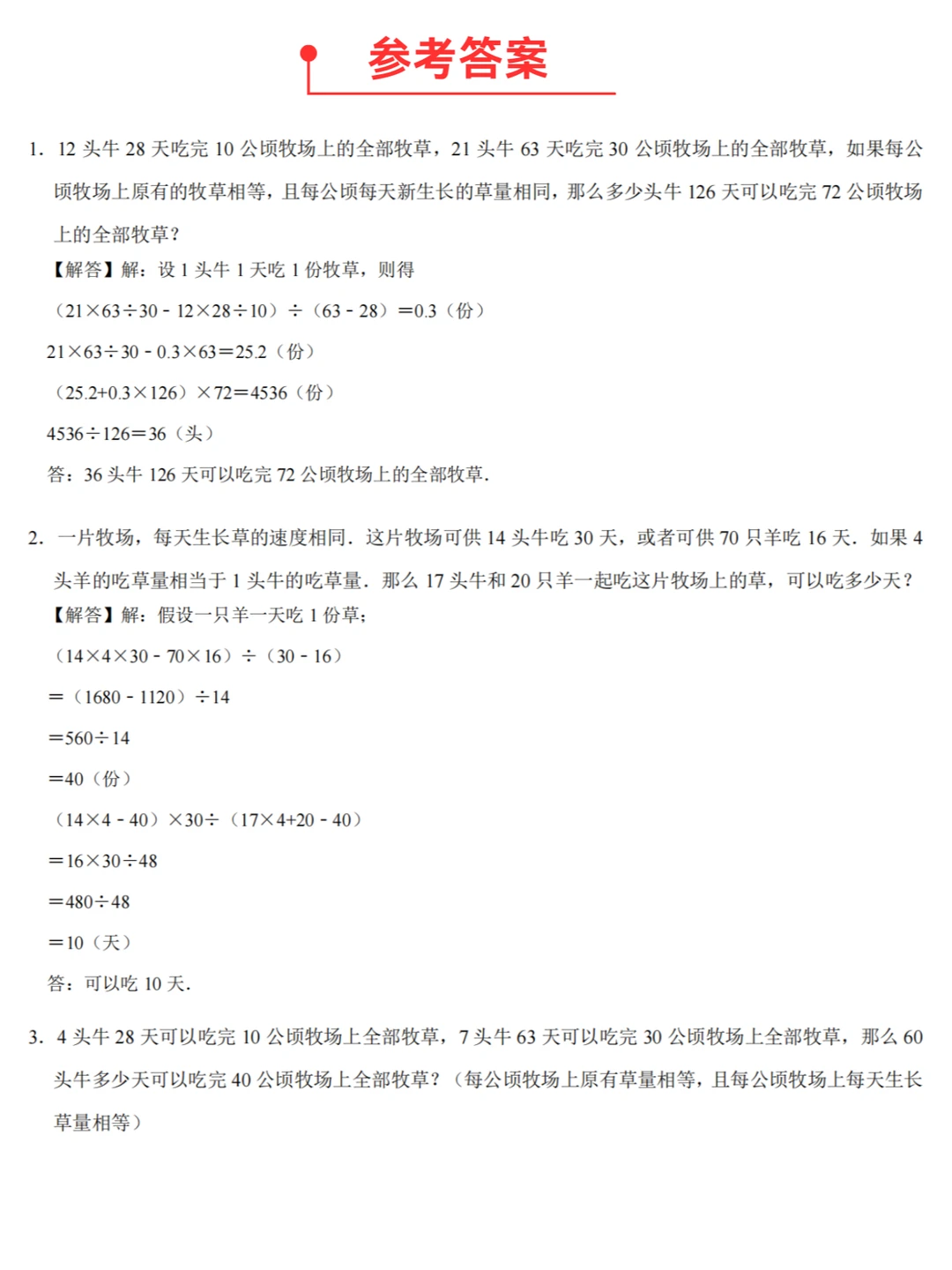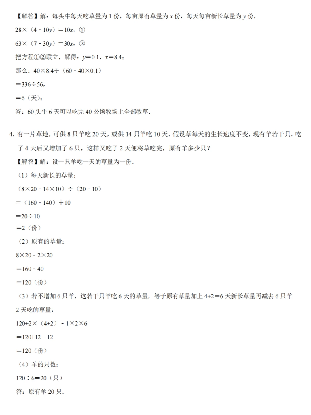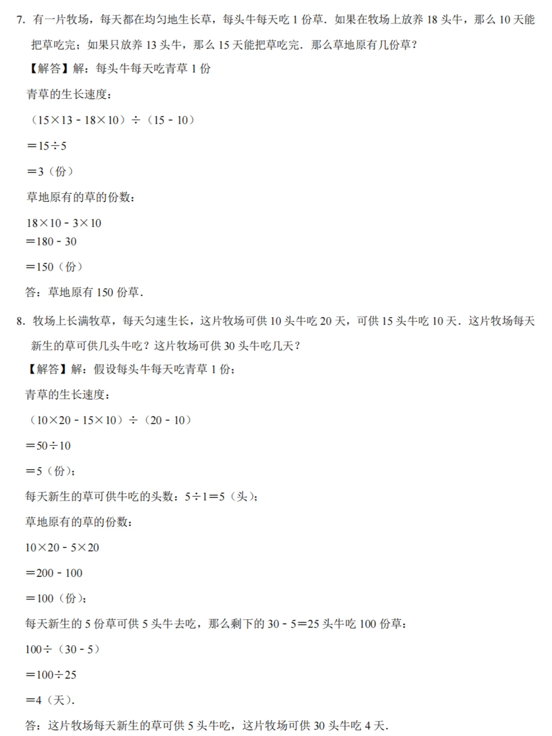1️⃣草的生长速度=(对应的牛头数×吃的较多天数﹣相应的牛头数×吃的较少天数)÷(吃的较多天数﹣吃的较少天数);