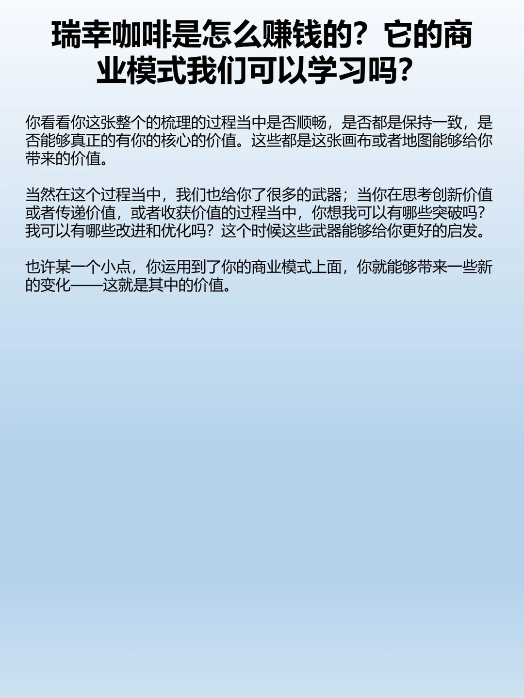 当然在这个过程当中,我们也给你了很多的武器;当你在思考创新价值或者传递价值,或者收获价值的过程当中,你想我可以有哪些突破吗?我可以有哪些改进和优化吗?这个时候这些武器能够给你更好的启发。