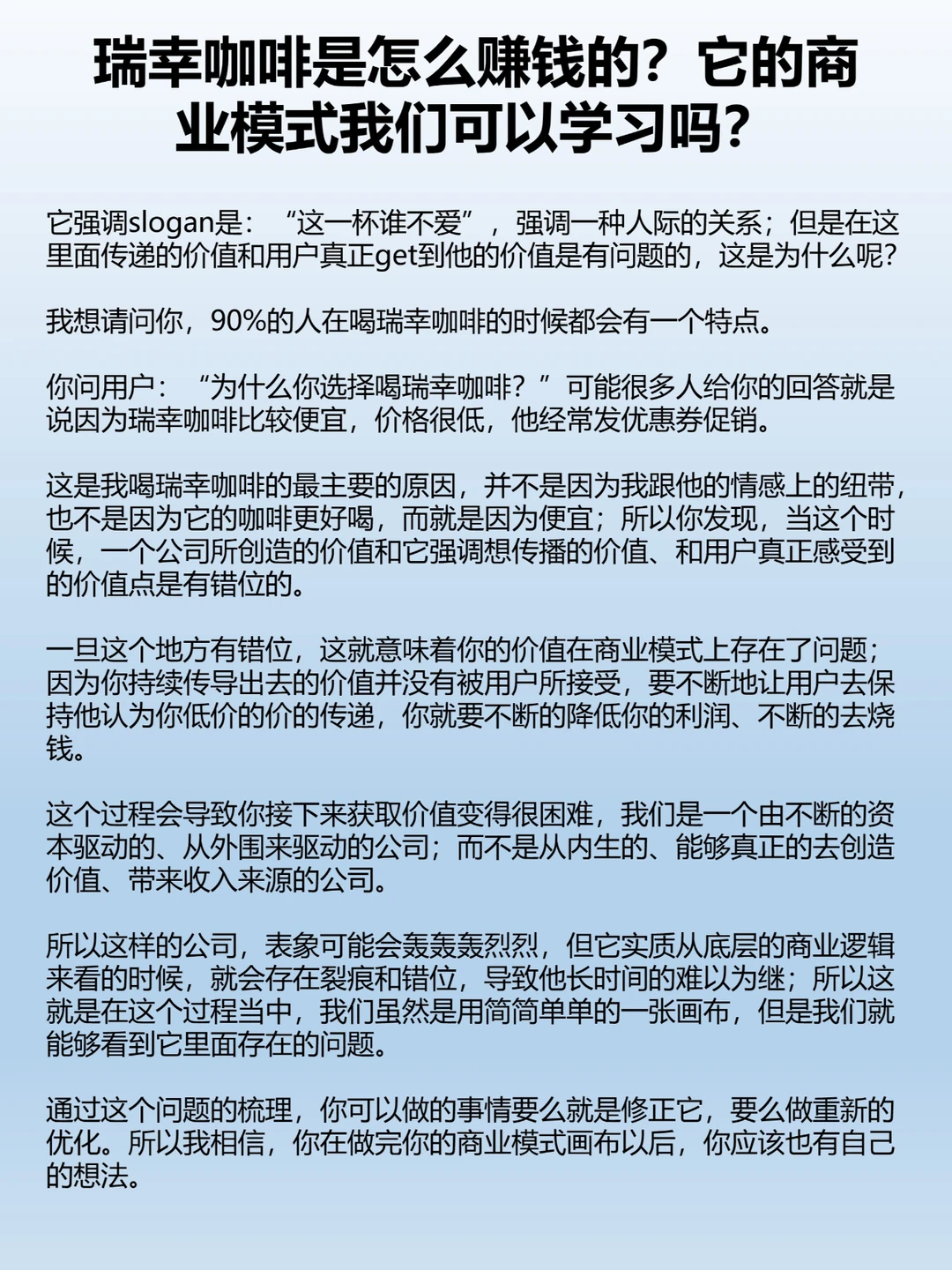 这是我喝瑞幸咖啡的最主要的原因,并不是因为我跟他的情感上的纽带,也不是因为它的咖啡更好喝,而就是因为便宜;所以你发现,当这个时候,一个公司所创造的价值和它强调想传播的价值、和用户真正感受到的价值点是有错位的。
