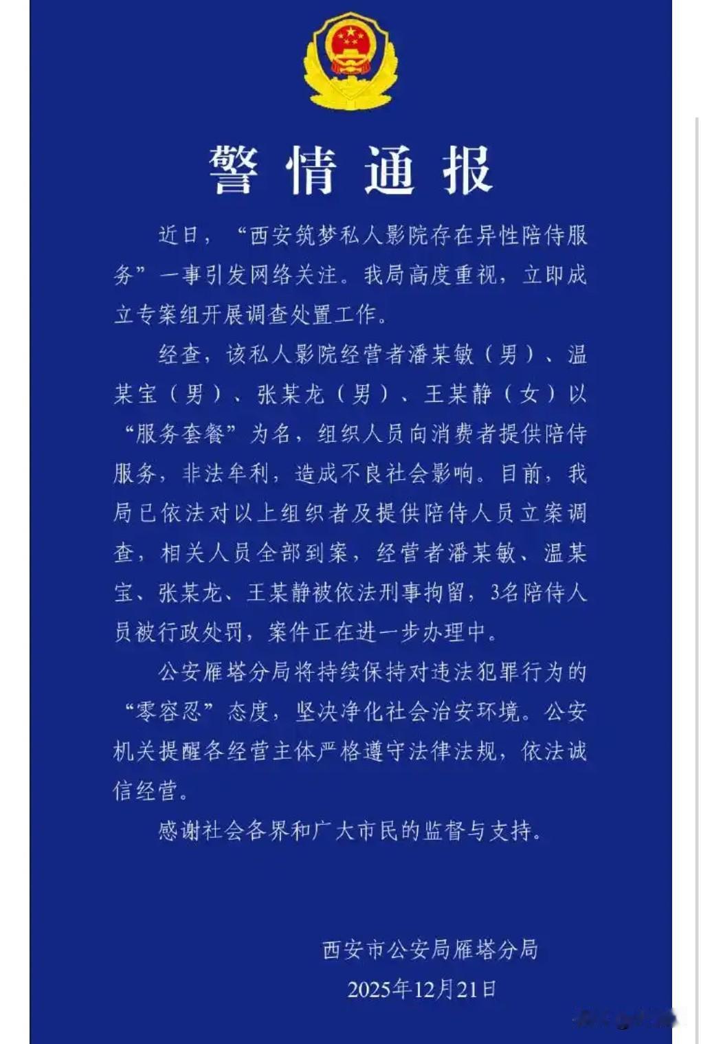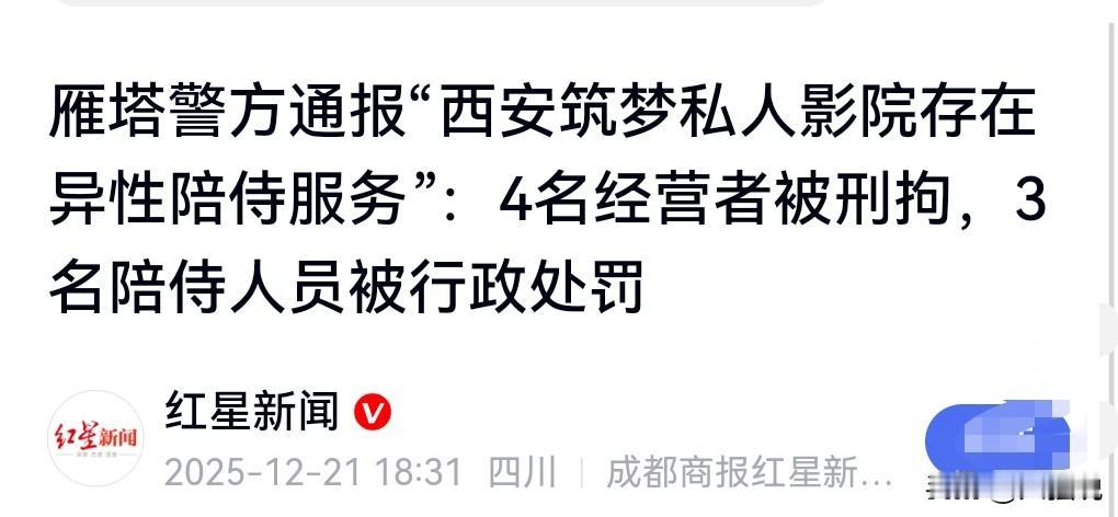 私人影院成有偿陪侍的场所,这就是挂羊头卖狗肉。 想不到近日却引发了关注啊。 西安有一家私人影院被盯上了。 4名经营者被刑拘,三名陪侍人员被行政处罚。 这可真是敲响了警钟啊。 还是赶紧改行吧。