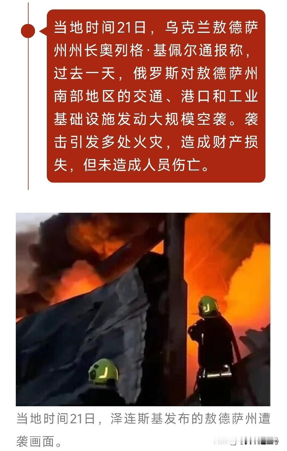 俄罗斯发动大规模空袭, 背后真相95%的人不知道! 当地时间21日,一则重磅消息炸锅了!乌克兰敖德萨州州长通报,俄罗斯对敖德萨州南部地区发动大规模空袭,交通、港口和工业基础设施都遭了殃,多处还起了大火,这动静可不小,到底咋回事啊? 原来啊,俄乌冲突背后有着复杂的地缘政治、历史遗留等诸多问题。就像这次空袭,看似突然,实则是长期矛盾积累下的爆发。此前双方就多次在相关地区有过摩擦,这次空袭也是冲突的延续。 冲突没有赢家,和平才是大家共同的期盼。国际社会应该积极推动双方通过对话和谈判来解决分歧,避免更多无辜的人受到伤害。 原来如此,战争带来的只有伤痛和损失。家人们,咱们都希望世界能多一些和平,少一些冲突。对于俄乌冲突,你有什么看法呢?快来评论区聊聊,一起为和平发声