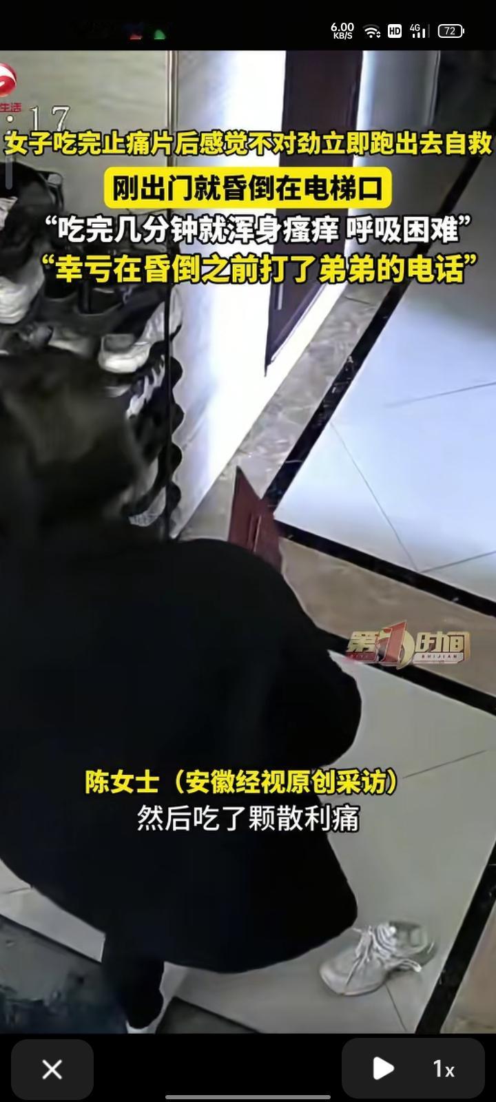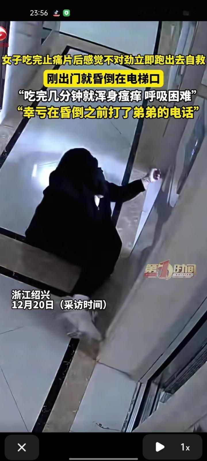 12月20日,浙江绍兴。女子吃完止痛片后感觉不对劲,立即跑出去自救,刚出门就昏倒在电梯口。 当事人陈女士表示,吃完止痛药后不到十分钟就浑身瘙痒,呼吸困难,完全休克。幸亏在晕倒之前打了弟弟他们的电话,他们赶到急忙把我送到急诊室,不及时就医就会有生命危险。 陈女士还提醒,大家一定不要随意吃药,千万要听医生的。