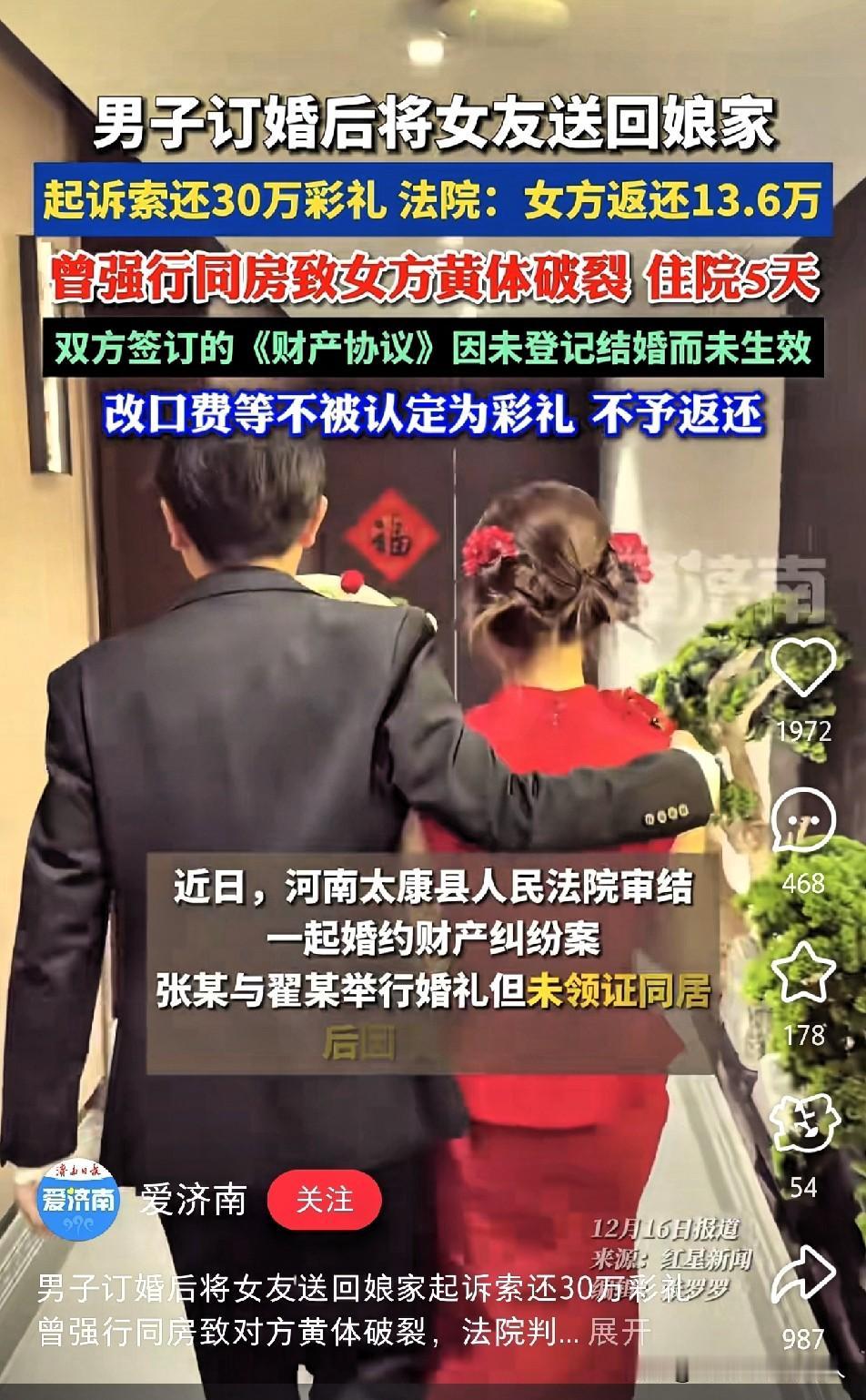刚订婚就闹到要退彩礼了! 就把未婚妻弄到黄体破裂,住了5天院。 人家姑娘伤口缝合线还没拆,他扭头就去法院告状,要退30万彩礼。 真是开眼了!世界之大,什么样的奇葩事都能遇上,简直颠覆认知! 这事发生在广西桂林,男方和女方刚订婚,没想到女方未婚妻因黄体破裂住院了,住院5天伤口缝合线也没拆。男方这边心里怕了,马上去法院起诉要退30万彩礼。 没想到法院的判决书给出了退13万6加三金的结果,理由竟然是男方有过错在先。 见到过很多奇葩的退彩礼,但是像这样未婚夫妻关系都没有领证,居然也能退,这让人心寒的是,居然没有任何感情因素的考量,直接用金钱来衡量一段感情的价值。 男方以为自己“赢”了这场官司,实际上是“输了”人心。谁还敢嫁女儿给他? 女方身体受创还遭起诉退彩礼,折射出部分婚恋关系中,女性身心权益易被忽视的现实问题。 法律给出的只有冰冷的数字,人心的秤却依然摇摆不定。这事还没完…… 你觉得法院这个判决结果合理吗?如果是你遇到这种事,会怎么处理?评论区等你发言!