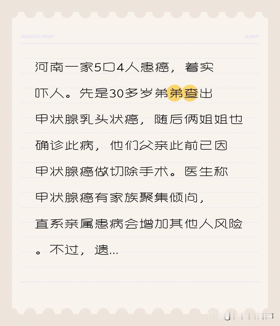 河南一家5口4人患癌,着实吓人。先是30多岁弟弟查出甲状腺乳头状癌,随后俩姐姐也确诊此病,他们父亲此前已因甲状腺癌做切除手术。医生称甲状腺癌有家族聚集倾向,直系亲属患病会增加其他人风险。 不过,遗传并非唯一病因,生活环境、习惯和情绪也可能诱发癌症。如一对50岁夫妻同时确诊,他们熬夜、吃外卖、争吵,这些负面习惯成“隐形杀手”。有癌症家族史的要筛查,生活中改掉不良习惯,夫妻少生气好好过。