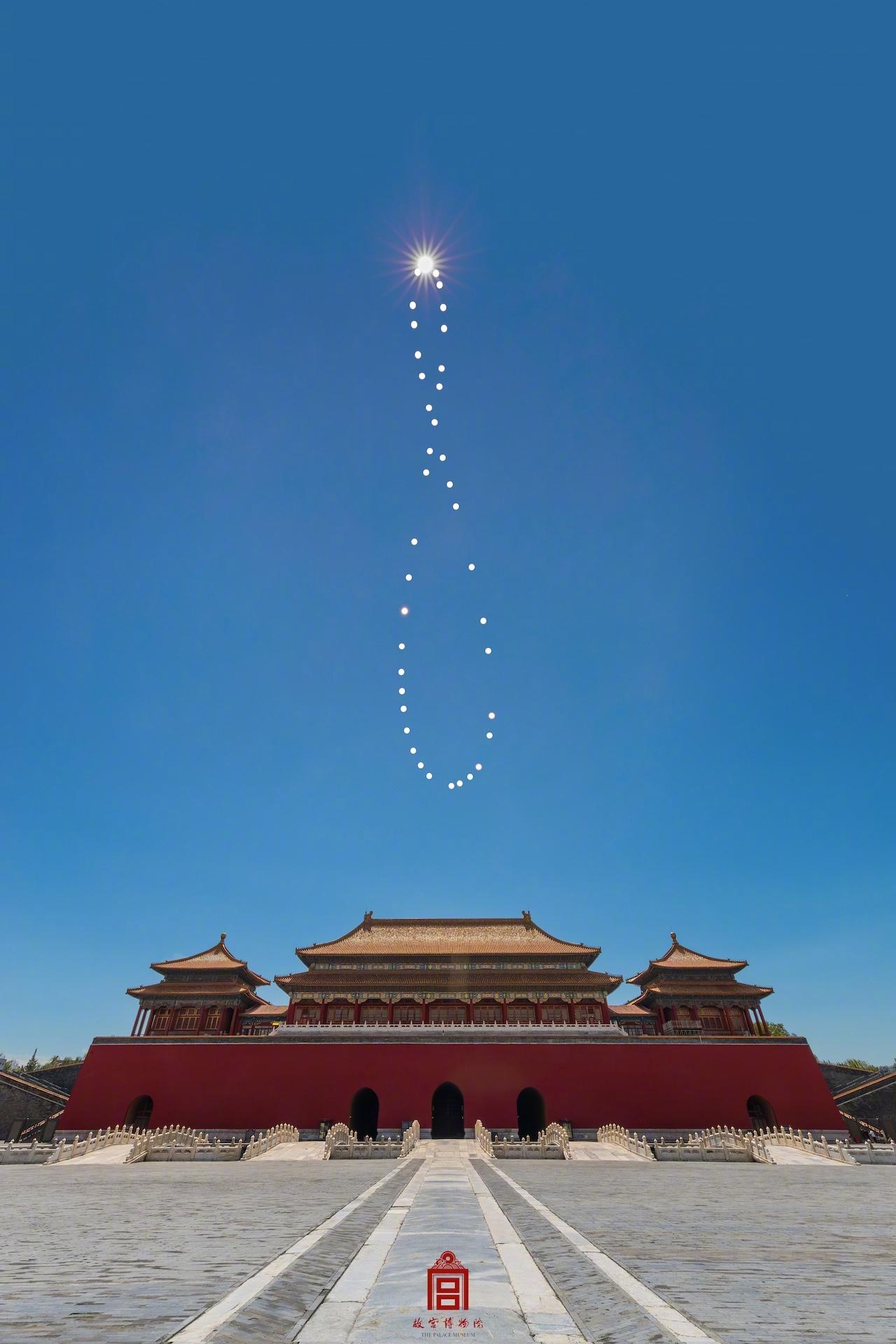 2025年,故宫博物院历经一年的时光,在每日同一时刻(中午12点)拍摄太阳在天空中的位置形成的轨迹。完成后在故宫中轴线上空呈现了“无穷∞”的印记...