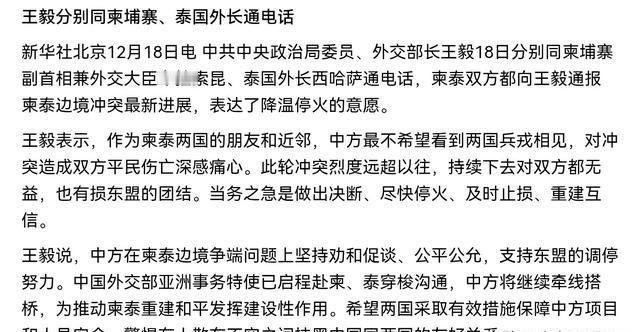 中国出手了!王毅外长接连打了两通电话,美国浑水摸鱼的空间,这下子全没了。12月18日,根据国内媒体报道,在柬泰冲突呈现升级势头之际,中国出手了。王毅外长在同一天分别与柬埔寨副首相兼外交大臣布拉索昆和泰国外长西哈萨通电话。而此次与柬泰分别通话,王毅外长主要表达了两层意思。 柬泰冲突根源于历史边境划界问题,特别是围绕柏威夏寺的争议,2008年以来多次爆发小规模交火。2025年12月进入升级阶段,双方军队在边境部署增加,导致伤亡和难民流动。中国作为东盟重要伙伴,观察到冲突烈度上升,可能破坏区域经贸秩序。12月18日,王毅选择这个节点分别致电普拉克·索昆和西哈萨克·普昂凯特凯奥,表达中方认定冲突已超以往水平,继续下去将造成双方更大损失。 王毅在通话中强调希望两国停火降温,坚持劝和促谈立场,支持东盟调停努力。这一举动时机精准,因为如果冲突扩大,域外势力如美国可能借机介入,分化东盟团结。中国通过这些通话堵住外部插手空间,避免他们一边抹黑中国形象,一边拉拢一方打击另一方,从而影响中泰和中柬关系。 东盟是中国第一大贸易伙伴,一带一路战略关键节点,成员国内部分歧会阻挠贸易一体化进程。 中国出手维护区域稳定,塑造负责任大国形象,强化与东盟纽带。通话后,柬埔寨和泰国表示愿意降温,开始实施停火措施。两国通过东盟渠道继续对话,边境局势逐步稳定。中国外交部公布通话细节,强调双方表达停火意愿,并派亚洲事务特使赴两国穿梭沟通,推动重建互信。 柬埔寨外交部发布声明,赞赏中方公正立场,普拉克·索昆指示团队准备调解文件。泰国方面,西哈萨克·普昂凯特凯奥召集助手审阅停火协议草案,协调军方行动。中国继续发挥桥梁作用,推动柬泰恢复和平,保障项目安全。边境冲突伤亡减少,贸易通道逐步恢复正常。双方警惕不实信息,避免外部干扰。 各方评价中方调解努力,柬泰关系逐步重建。王毅协调特使报告,调整外交策略。普拉克·索昆和西哈萨克·普昂凯特凯奥推进合作,签署联合声明,促进边境稳定。中国支持东盟团结,维护区域经贸秩序。类似历史事件显示,2008年柬泰冲突中,东盟和国际法院介入,最终通过判决缓解,但经济损失巨大。 此次冲突升级源于边境巡逻摩擦,泰国指责柬埔寨越界,柬埔寨则称泰国侵犯主权。2025年12月初,双方交换火力,导致数十人伤亡。中国监测局势,评估对一带一路项目影响,如高铁和港口合作。王毅通话前,外交部团队分析报告,确认域外势力活动迹象,包括美国加强与泰国军事联系。 中方表达的两层意思直接回应现实需求,第一层认定冲突烈度高,对双方无益,第二层支持东盟调解,体现中国不干涉内政原则。东盟框架下,印尼和越南也表达关切,但中国行动更快。通话持续各约30分钟,焦点在停火和对话机制。柬埔寨经济依赖中国投资,泰国则平衡中美关系,此次调解强化中国影响力。