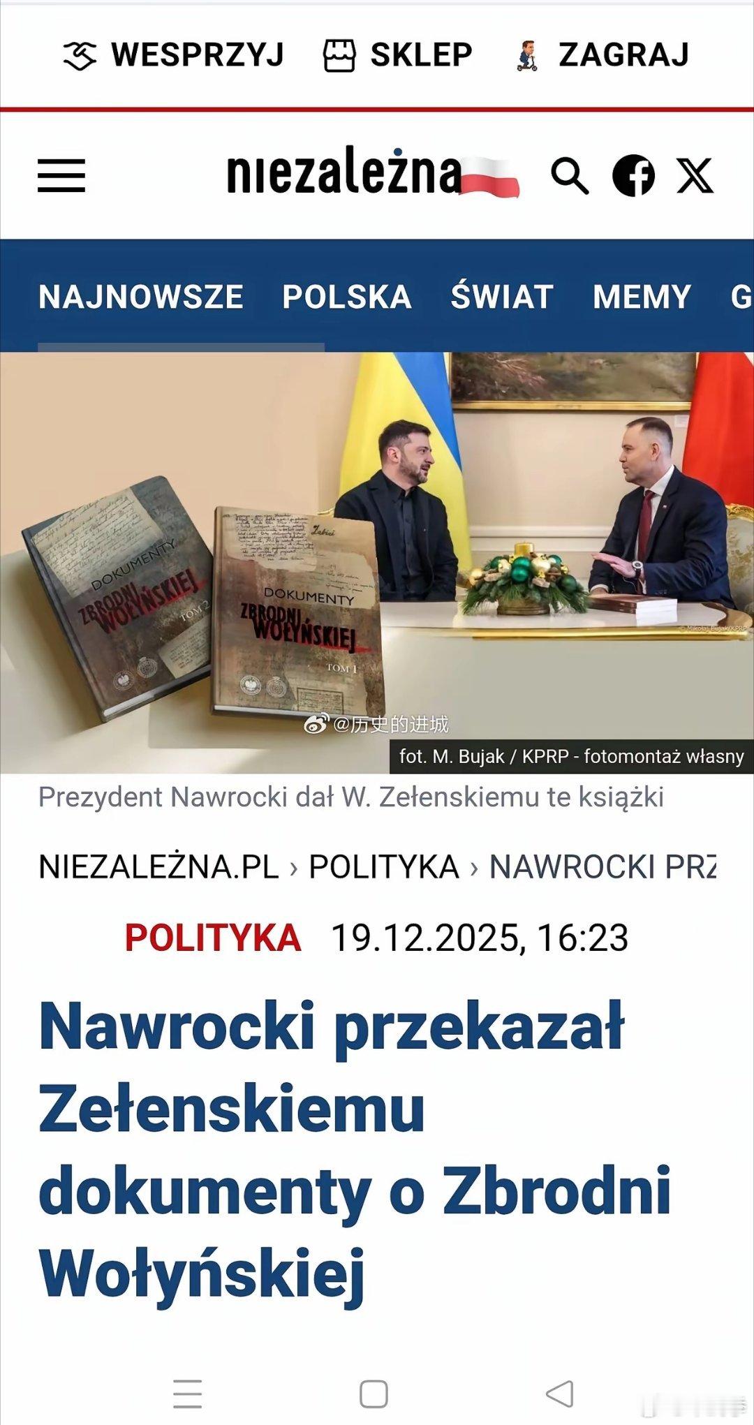 据波兰媒体报道,乌克兰总统泽连斯基19日抵华沙正式访问,与波兰总统纳夫罗茨基会晤。 纳夫罗茨基当面赠送泽连斯基一套详载二次大战期间乌克兰纳粹军队屠杀10万波兰人的专著,这份礼物具有高度历史与政治象征意涵,引发外界关注。