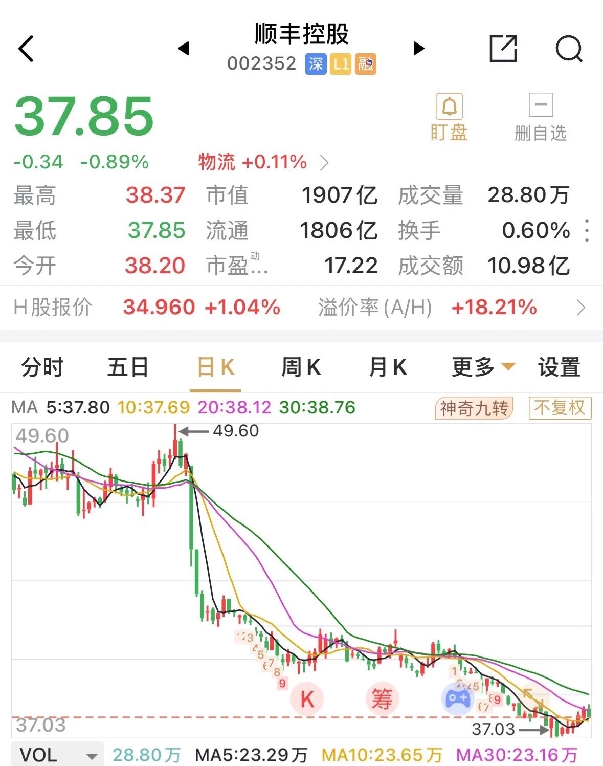 顺丰周五尾盘集合竞价单针探底,成交8.15万手,近乎成交额3.0亿元,几乎是全天交易量1/3,下跌0.89%,收37.85元。连续收数个交易日小阳线,戛然而止。跌幅虽不大,原因似乎是因为被调出富时A50强制调仓所引起的。可这消息却明显是好几天前的。当然顺丰控股近段时间走势比较弱,似乎什么样子都能接受,还处于弱势寻底阶段。目前想要有所改变,估计仍得等到基本面持续向上改善的预期落地。