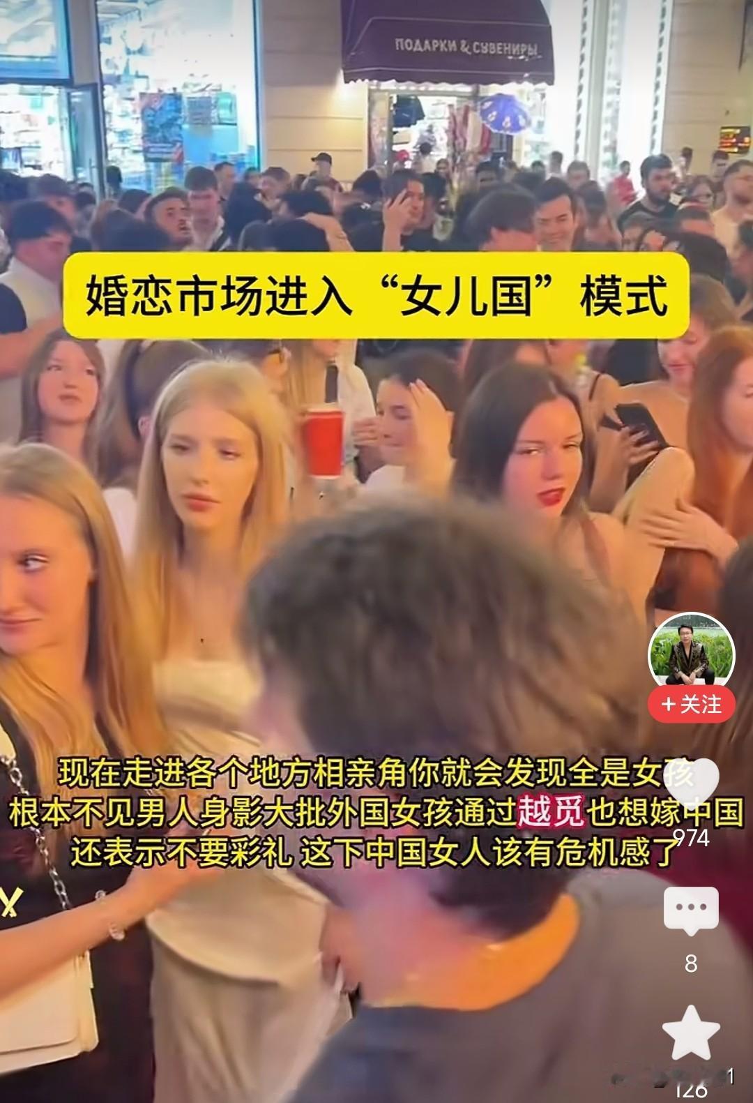 怎么办, 现在的婚恋市场出现阴差阳错,全是女的,没有男的,到处的婚恋市场是女儿国的现象,婚恋相亲的地方看不到男的,现实生活中是男的多,女的少,相亲市场上还没有男的。 现在现实生活中男的谈不起恋爱,男的也不愿意谈恋爱了,现在很多男女不结婚。 男人结不起婚,从处对象开始就男的花钱,买房子,买汽车,买三金,给彩礼,样样都是男方花钱,这一套组合拳下来没有一百五十万解决不了,结婚后能不能过日子谁也不知道,还有结婚后几天厉害的,现在男人怕了。 很多举办婚恋市场没有男人了,上海,广州,深圳大城市的婚恋市场都一样,全是女儿国。 据说深圳男的不用花钱可以参加婚恋市场相亲,这种情况下男女比例1:50,男女婚恋市场比例严重失调。 这种现象怎么解决,城市女的多,30多岁没结婚的很多,她们不将就,非要找比自己工资高的,还要体制内的,现在女性地位提高了,男女平等了。女性地位提高不是来打压男性的,现在女性朋友对男性要求太高,女性结婚就要找比自己强的多的,收入要比自己高,工作要比自己好,家庭条件还要比自己家好的,这些也是正常。 可惜现在体制内大多都是女性,还要找比自己好的,去哪里找呢? 追求比自己强的对象正常,越是条件好的女性,社会地位高的,文化水平高的,往往都找不到对象,看谁都不如自己,不能将就,怎么办? 这些问题谁能解决? 婚恋市场上还有一些外国女性,欧洲和俄罗斯,东南亚国家的女性也来中国找对象了。 中国没有结婚,或者找不到对象的男人大多在农村。 城市女人多,农村男人多,所有男性朋友还没有结婚的一定要到城市来追求自己的生活。