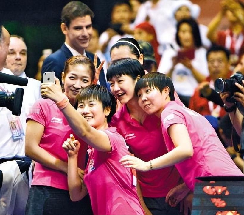 4朵金花满面春风玩自拍:乌发覆额的陈梦龙眉凤目,笑容如露;拿着手机的丁宁细眉飞扬,樱唇榴齿;扎着辫子的刘诗雯盈盈含笑,目光如霖;戴着手串的朱雨玲凤眼如虹,玉指如葱,女乒姑娘们青春无敌的快乐气息扑面而来,真让人赏心悦目呀!