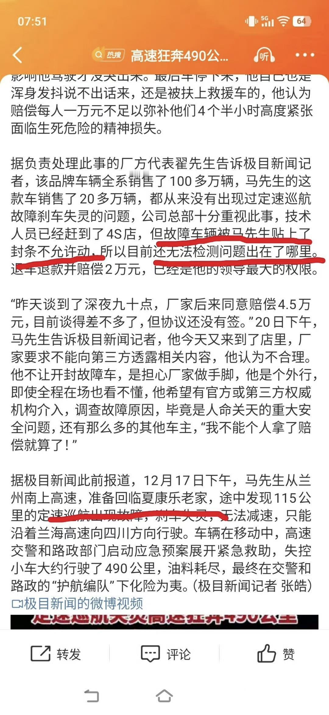 高速狂奔490公里司机要求退车退款 这个事情就很难办了,他的车是一汽奔腾B70,他要求退款退车,赔偿5万精神损失费。 而且一汽奔腾的领导咋想的,这么着急就承认自己有问题了? 这个车主不让厂商动他的车,那厂商怎么调查事故,怎么查原因,到底是为什么同时出现“巡航失灵”和“刹车失灵”呢? 【来自懂车帝车友圈】