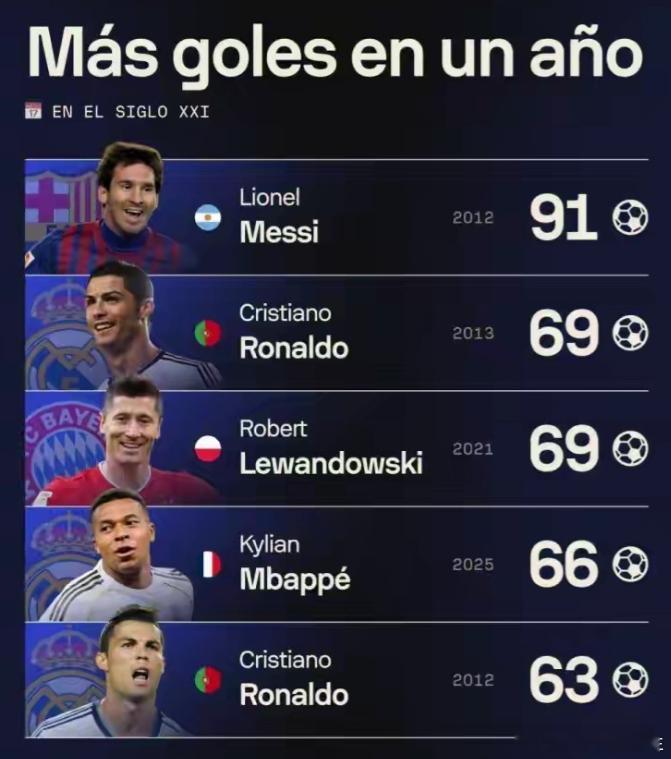 本世纪自然年进球榜梅西第一:1、第一名:梅西——91球(2012)2、第二名:C罗——69球(2013)3、第三名:莱万——69球(2021)4、第四名:姆巴佩——66球(2025)5、第五位:C罗——63球(2012)C罗梅西