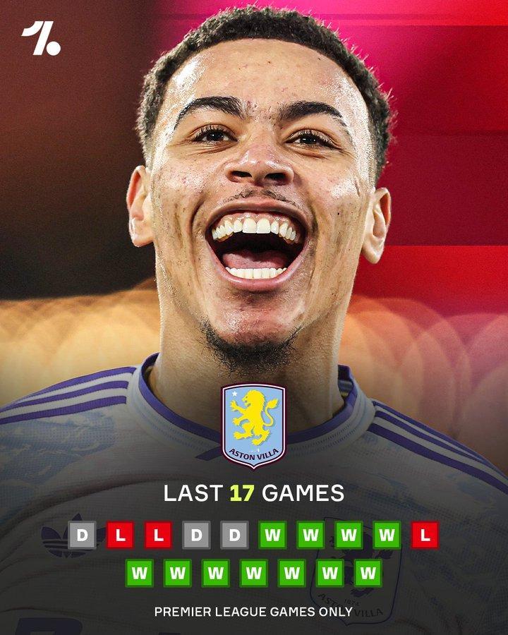 阿斯顿维拉本赛季强势反弹……赛季初的五场英超联赛他们一场未胜,前四场比赛甚至颗粒无收。但🤯此后他们只输了一场,圣诞节时与领头羊阿森纳的积分差距将只有三分。👀他们或许会成为冠军的有力争夺者……