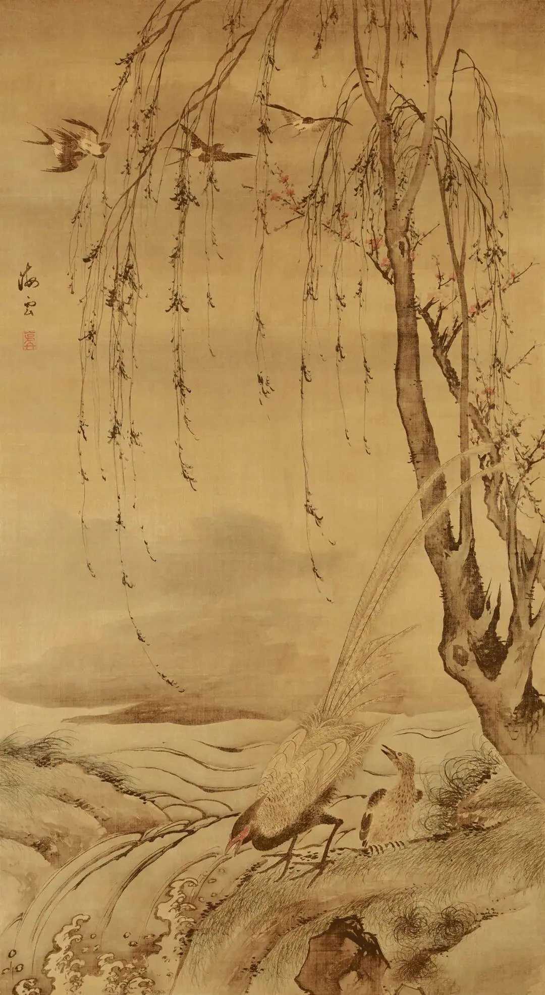 明 汪肇《柳禽白鹇图》,绢本 立轴 设色 190x103 厘米,故宫博物院藏。图绘春日景色,燕子飞来,柳叶发芽,桃花盛开;柳树下溪水汇合向下奔流而去,一只成年白鹇似低头觅食,尾翎修长绚丽,另一只似幼鸟,羽毛未封,立于岸边斜头仰起。 汪肇,字德初,明代画家,本幅花鸟精细生动,景色自然清新。汪肇(安徽休宁人),字德初,号海云,明代浙派晚期代表画家之一。其艺术风格出入戴进、吴伟之间,擅长山水、人物及写意花鸟,用笔豪放草率,兼善指墨技法。这就是中国风遇见艺术