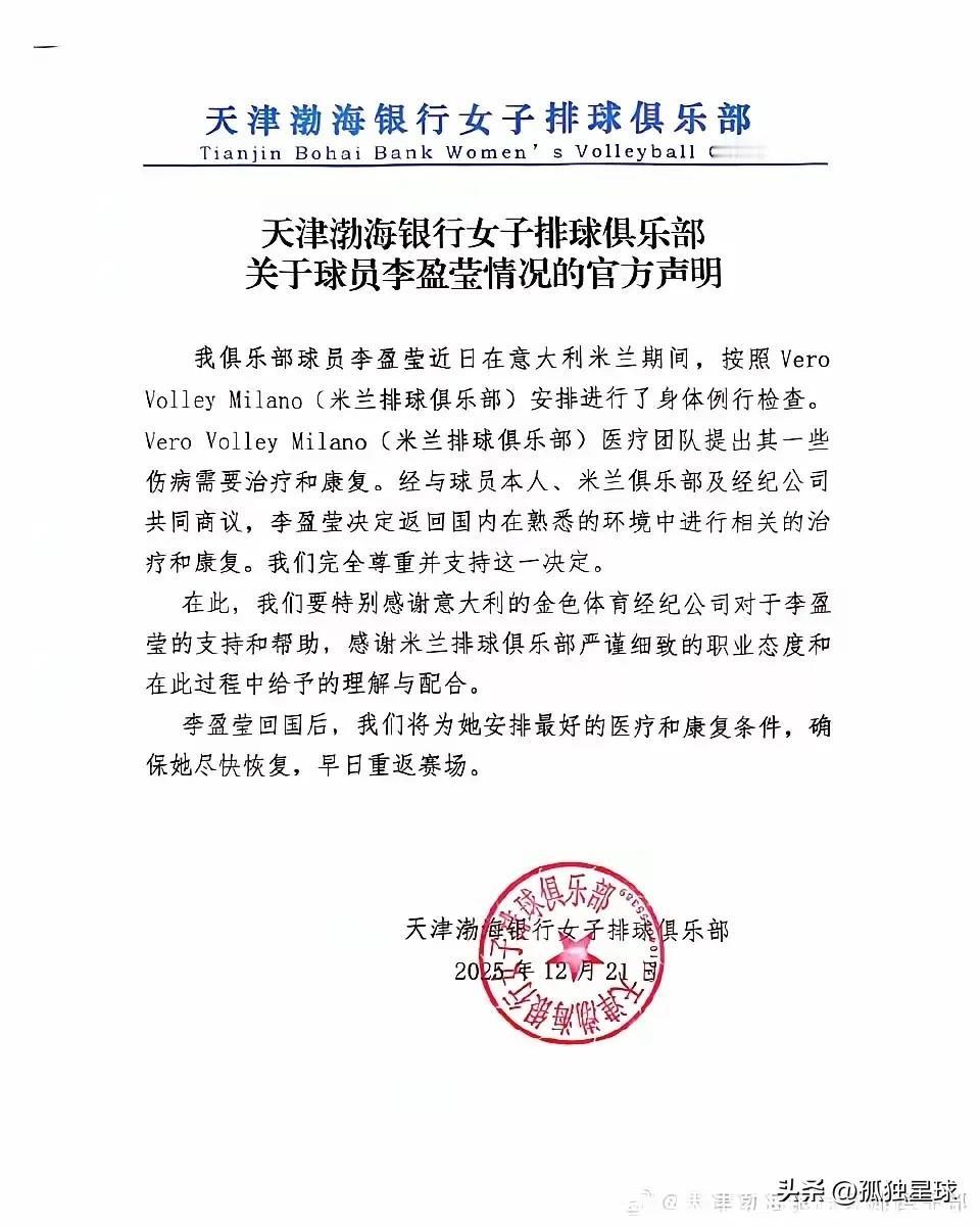 天津女排声明:看了有点“想笑”! 天津女排声明中说:感谢米兰俱乐部严谨细致的职业态度。天津女排终于知道,什么是严谨细致的职业态度了吗?以前你们不知道吗? 天津女排声明中说:我们将为他安排最好的医疗和康复条件,确保她尽快康复,早日重返赛场。是不是既然去不了国外,想早日让李盈莹出来打国内联赛呢?是不是还像全运会一样,连打澳门队,打排位赛,都不愿意让都不愿意让李盈莹轮休一下呢?
