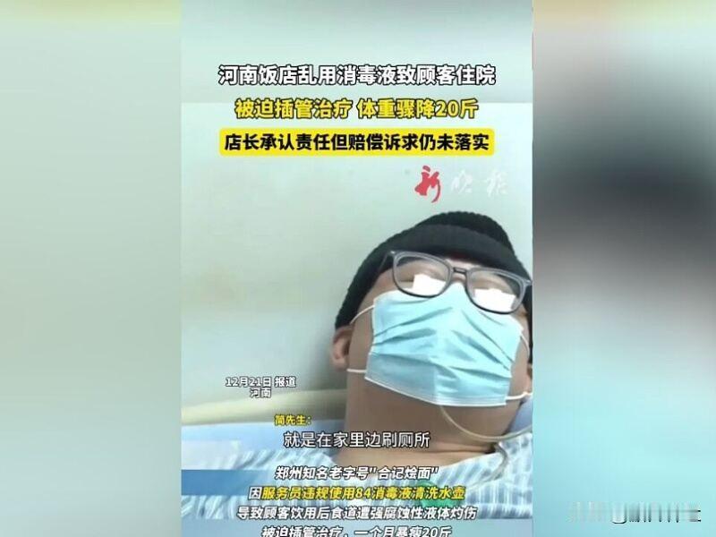 饭店乱用消毒液致顾客暴瘦20斤 近日,郑州一饭店用消毒液泡水壶,顾客喝水后食道被腐蚀,一个月暴瘦20斤。目前,河南省消费者协会已介入调查