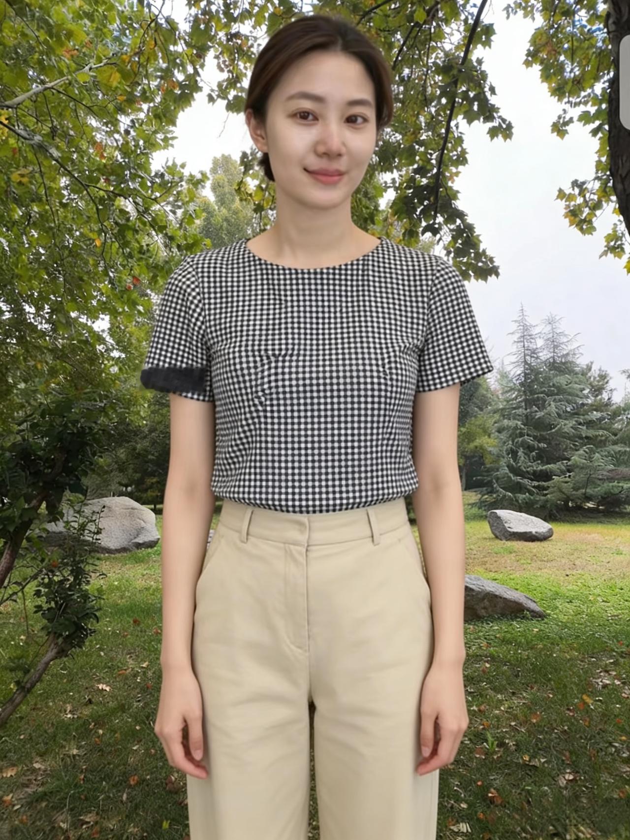 枝头叶的绿,筛下碎的光 她站在林间,格纹衫是黑白的浪 卡其裤的暖,接住了风的凉 像秋,落在了夏的尾上 ~ 发丝挽起,露出光洁的额 笑容浅淡,如湖面的波 石头卧在草里,是沉默的伴 树影摇着,晃碎了时间的壳 ~ 格纹是棋盘,她是落子的人 站在林间的方寸,自成乾坤 风拂过衣摆,卷走蝉的鸣 只留下,叶与叶的私语轻轻 ~ 她的姿态,是松弛的诗 每一个褶皱,都藏着温柔故事 林间的光,吻着她的肩 像岁月,待她眉目慈善