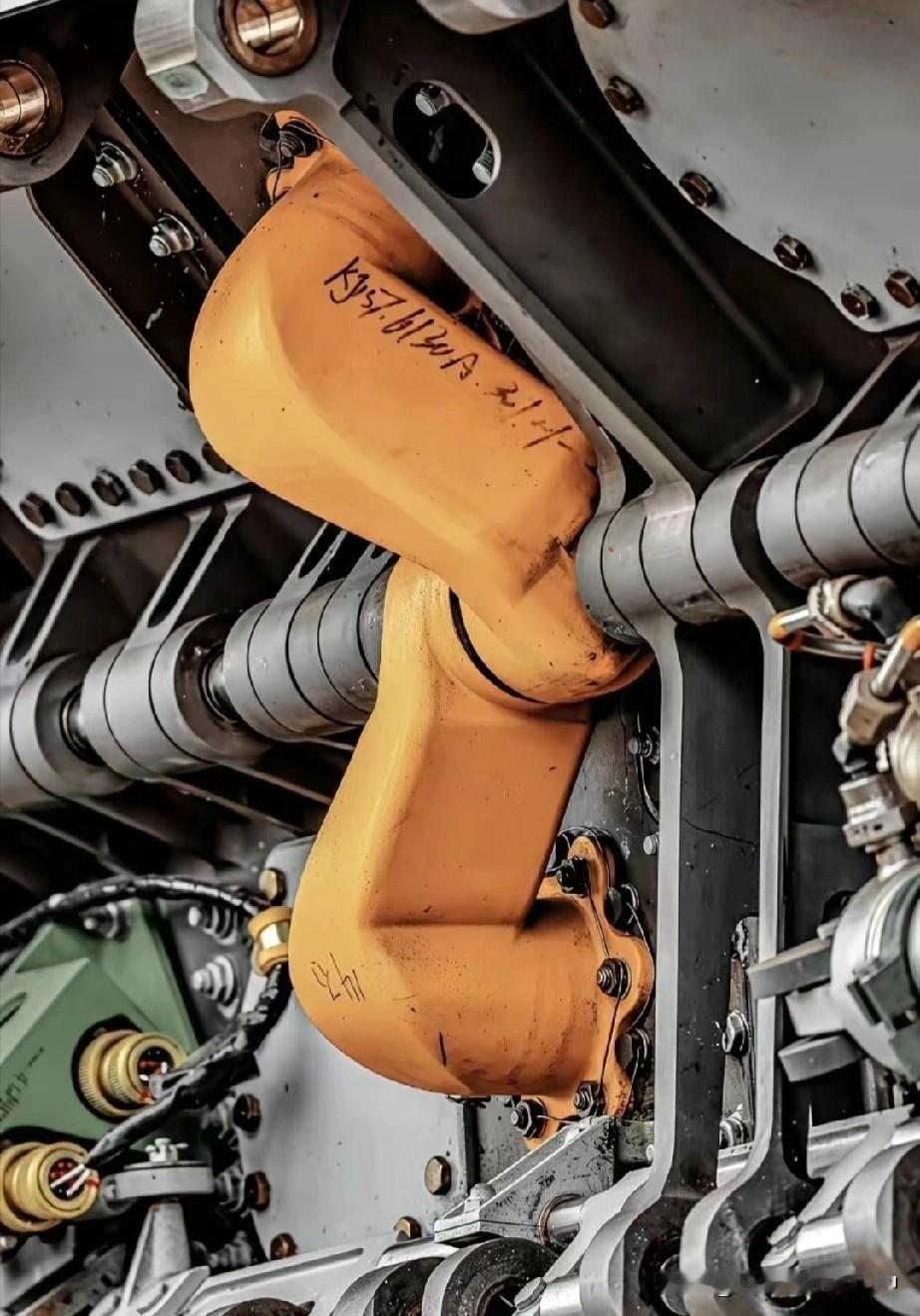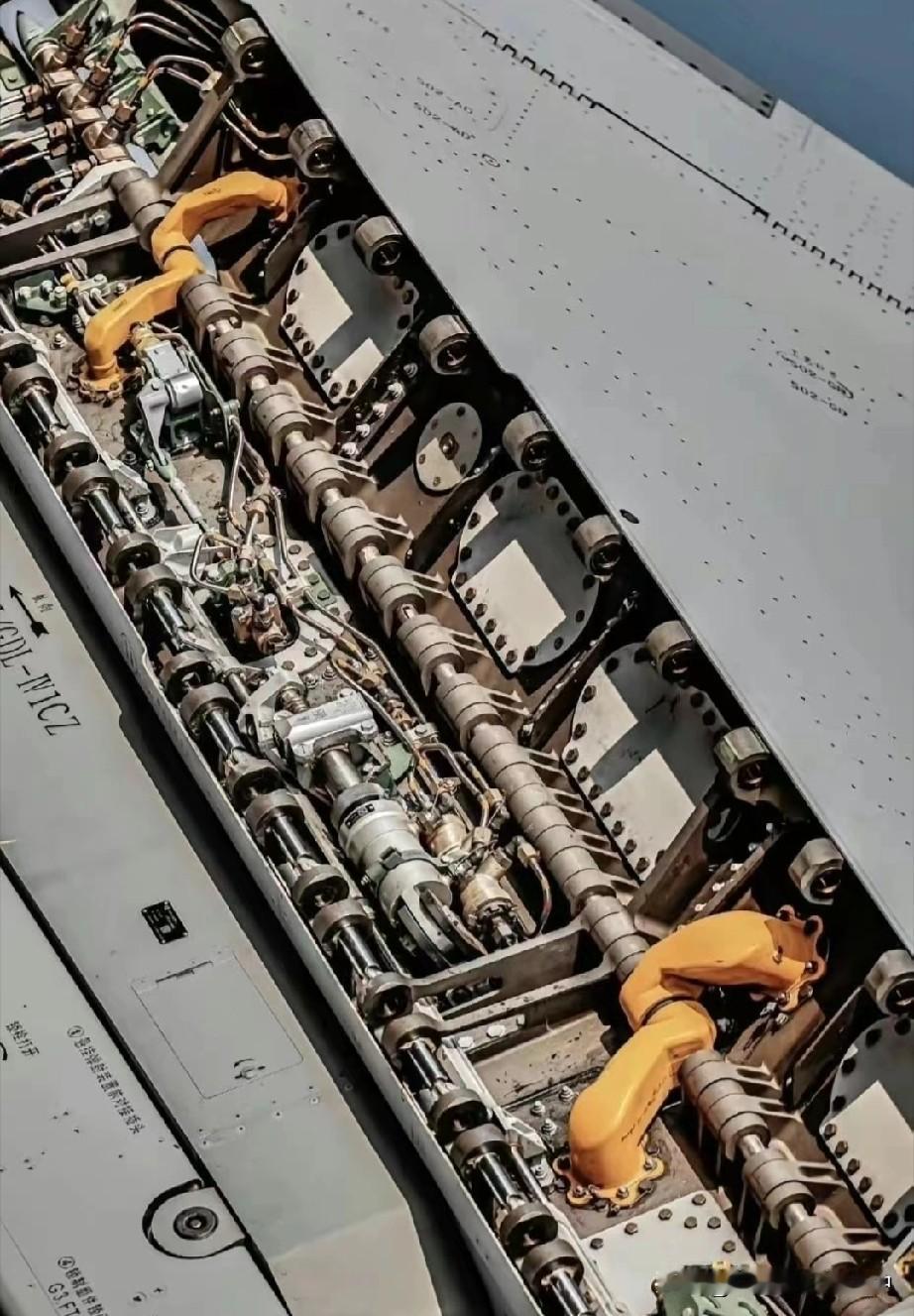 歼15T折叠翼机构近距离展示,线条粗犷不失美感... 橙黄色的液压管路沿着机翼主梁精准排布,连接着直径超10厘米的大型液压作动筒——正是这套系统,能在30秒内完成机翼的折叠与展开,满足航母甲板快速调度的刚需;纵横交错的精密齿轮传动组件、高强度合金钢打造的折叠铰链,单铰链承重就能达到数吨,牢牢锁住机翼,哪怕在舰载机弹射起飞的巨大牵引力下也纹丝不动;还有表面布满防滑纹路的金属基座、带自锁功能的锁紧螺栓,每一颗都经过上万次疲劳测试,杜绝海上高盐雾环境下的故障风险。 能承受舰载机起降的巨大应力,还要在甲板上实现快速、稳定的机翼收纳——折叠后机翼横向占用空间缩减40%,让航母机库能多停放近1/3的舰载机,直接提升航母的作战载机量。