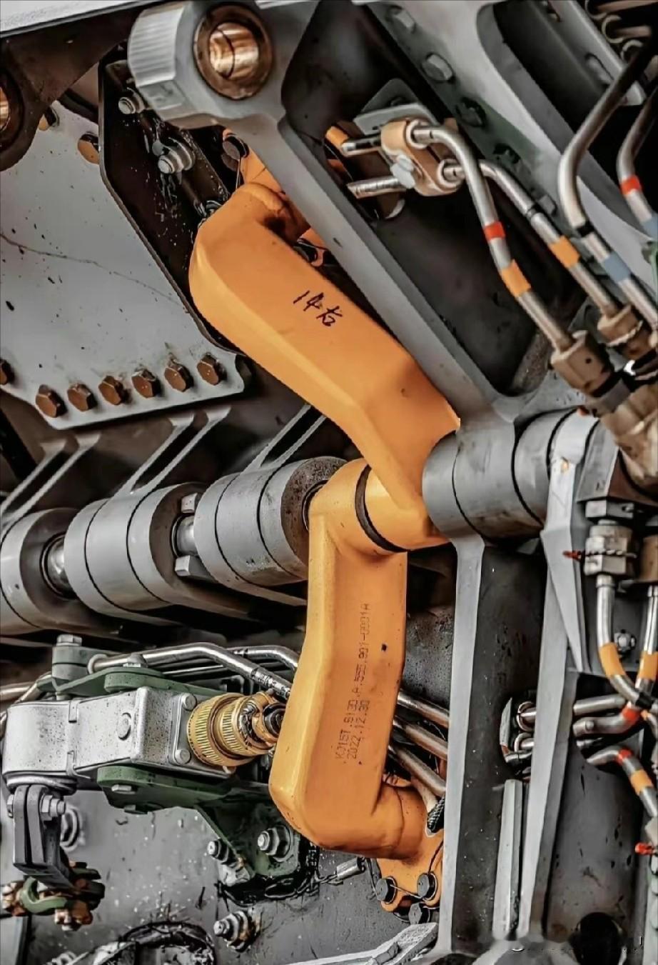 歼15T折叠翼机构近距离展示,线条粗犷不失美感... 橙黄色的液压管路沿着机翼