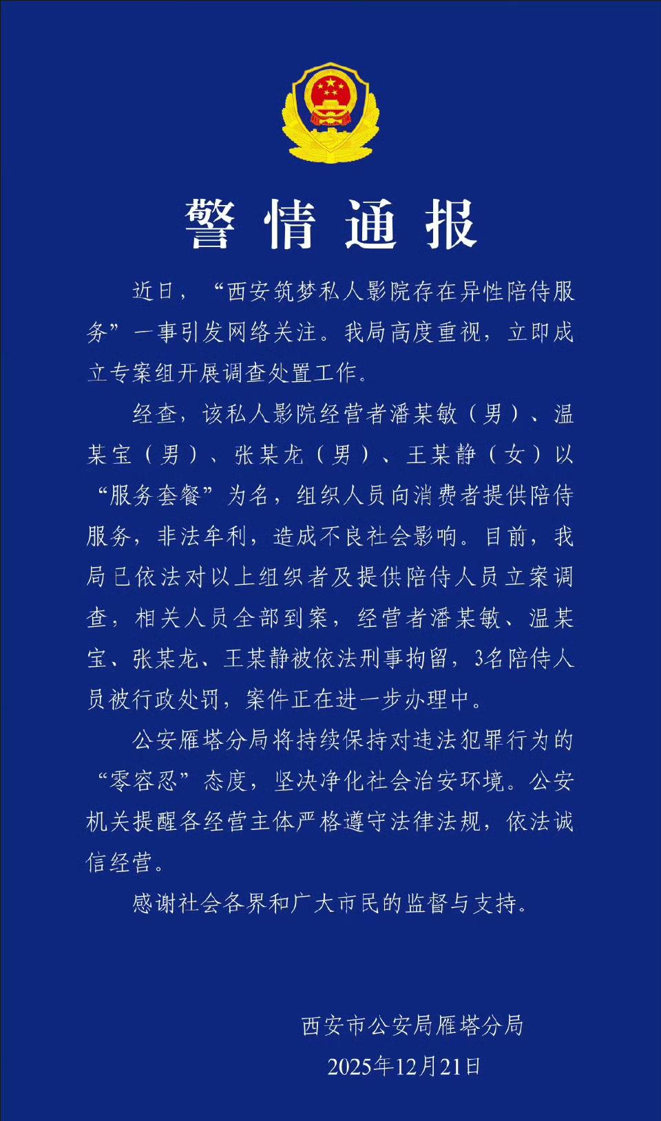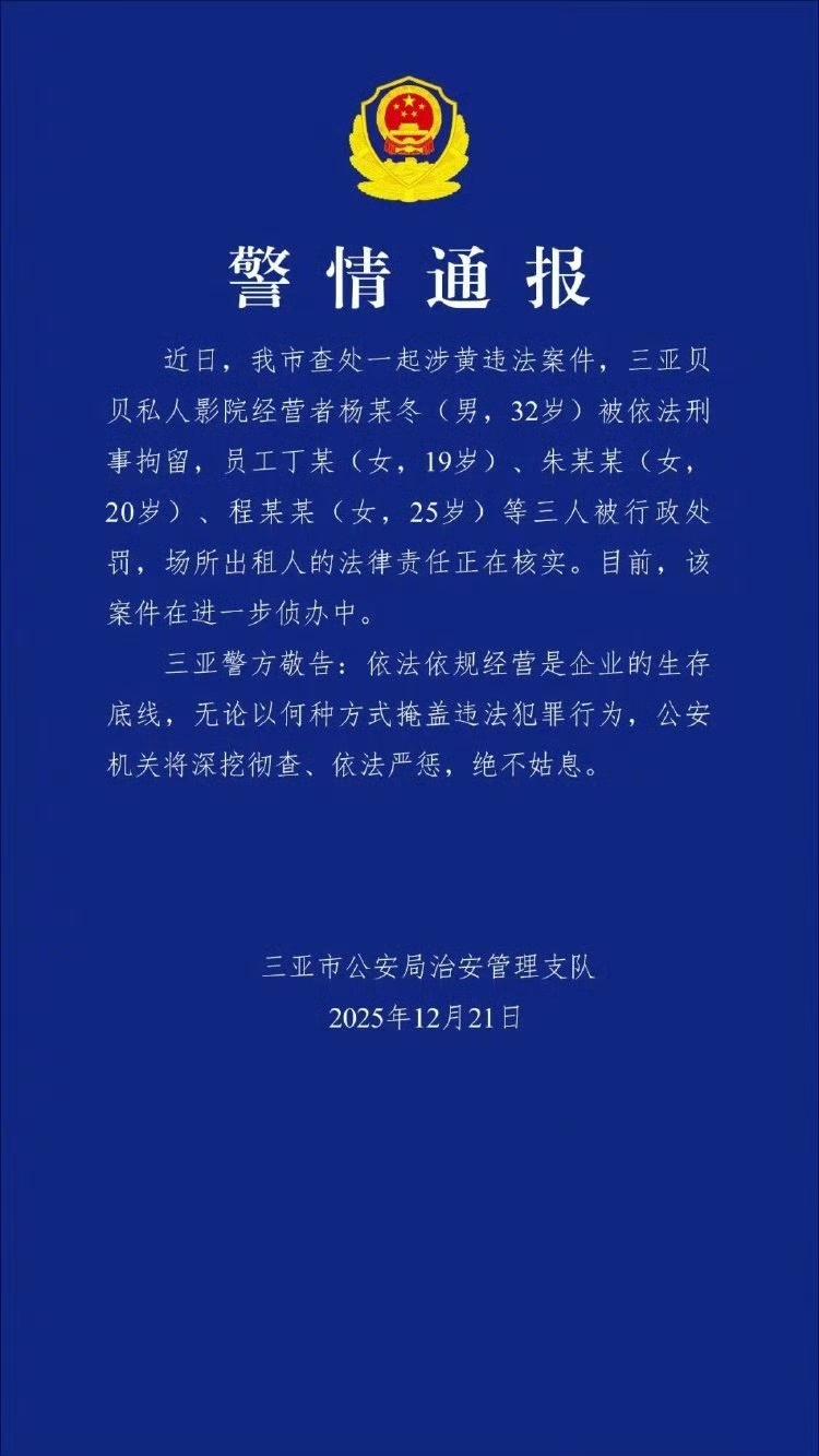“舌吻摸胸”、“飞机释放”、还能“带走过夜”。。。12月21日,西安、成都、三亚三地警方同步通报私人影院涉黄案件,严刑厉法,重拳出击! 其实从往年来看,大规模扫黄一般是在警方而夏季攻势里,今年是要晚上一些的。 私人影院,听着浪漫,实则这类场所往往以"影视放映"注册,实际经营却涉及多个部门,易出现监管盲区。加上商家多藏身商住楼、靠线上模糊宣传引流,交易隐蔽、取证困难,让部分逐利者有恃无恐。与之类似的还有不会打台球的台球助教,五音不全的KTV陪唱。 值得注意的是2026年起,卖淫嫖娼的行政违法记录将会封存,不得向任何单位和个人提供或公开,属个人隐私,私人更无权查询! 但卖淫嫖娼是危害社会风气的毒瘤,警方会持续依法严厉打击!