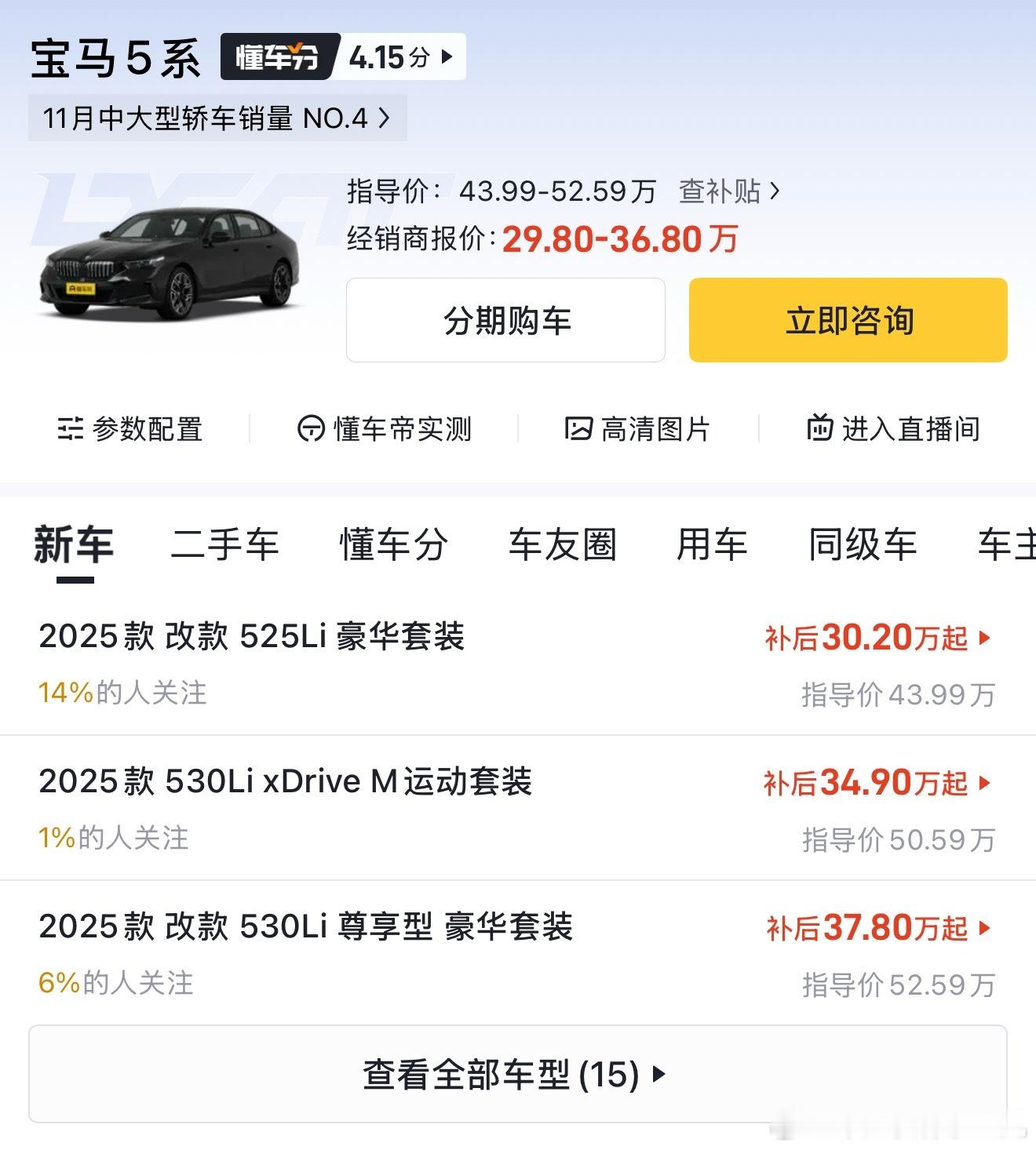 宝马5系现在都30多万了! 这个价格相对于前几年简直就是腰斩!销量跌!价格也在不断下探!同时还伴随着减配、运动属性减弱、服务体系差等 只给外国人甜筒的骚操作也是败坏路人缘