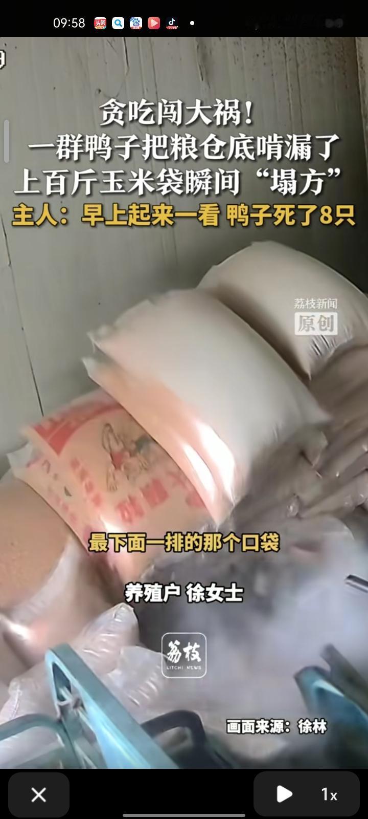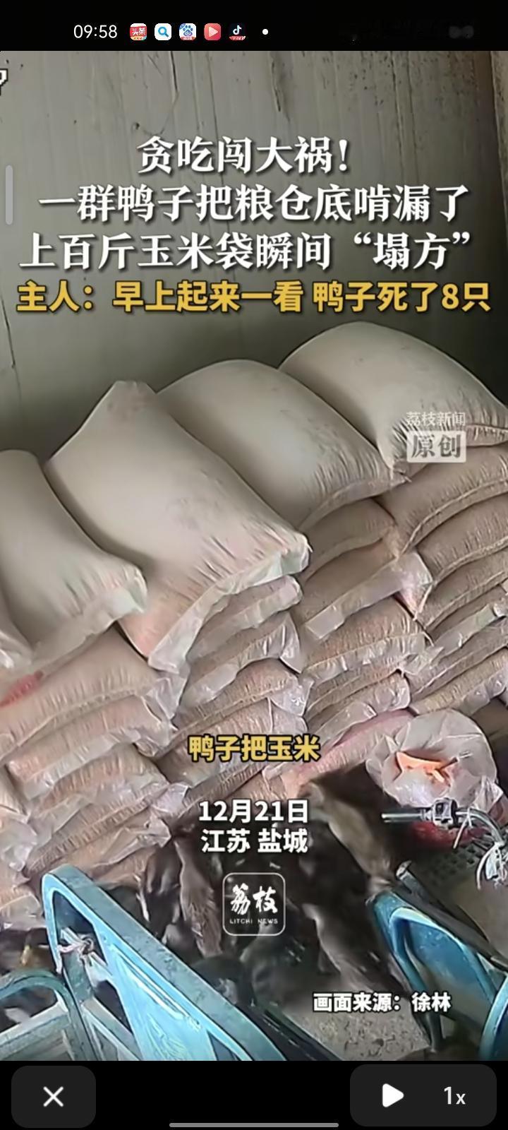 12月21日,盐城市滨海县。女子晒出监控视频,一群鸭子把粮仓啃漏,上百斤的玉米袋彻底塌方,鸭子们被压在里面。早上起来一看,鸭子死了八只,损失倒是能接受。