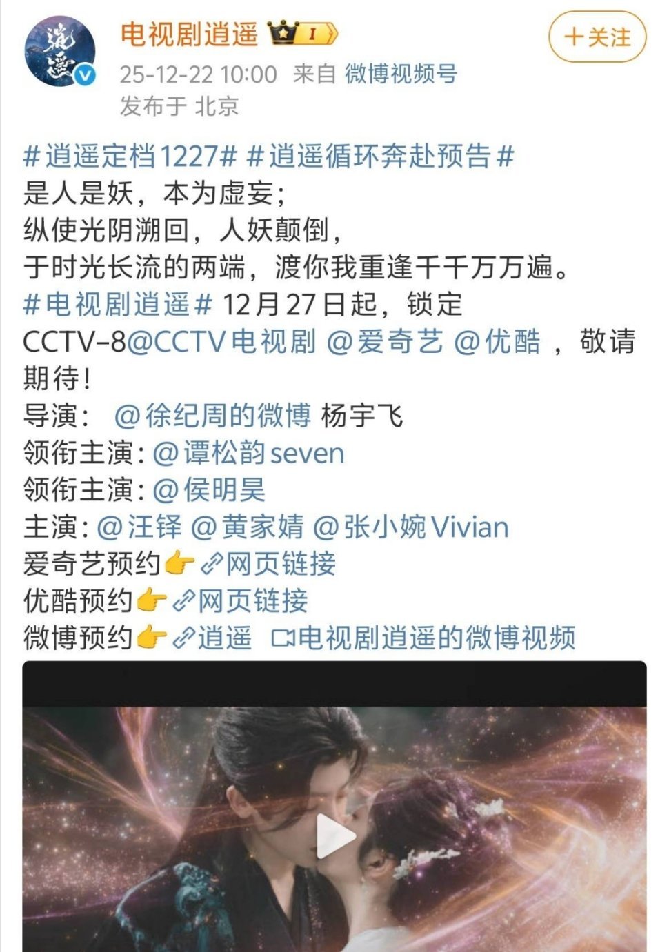 谭松韵、侯明昊《逍遥》官宣定档12月27日🐏八➕🥝➕👖播出