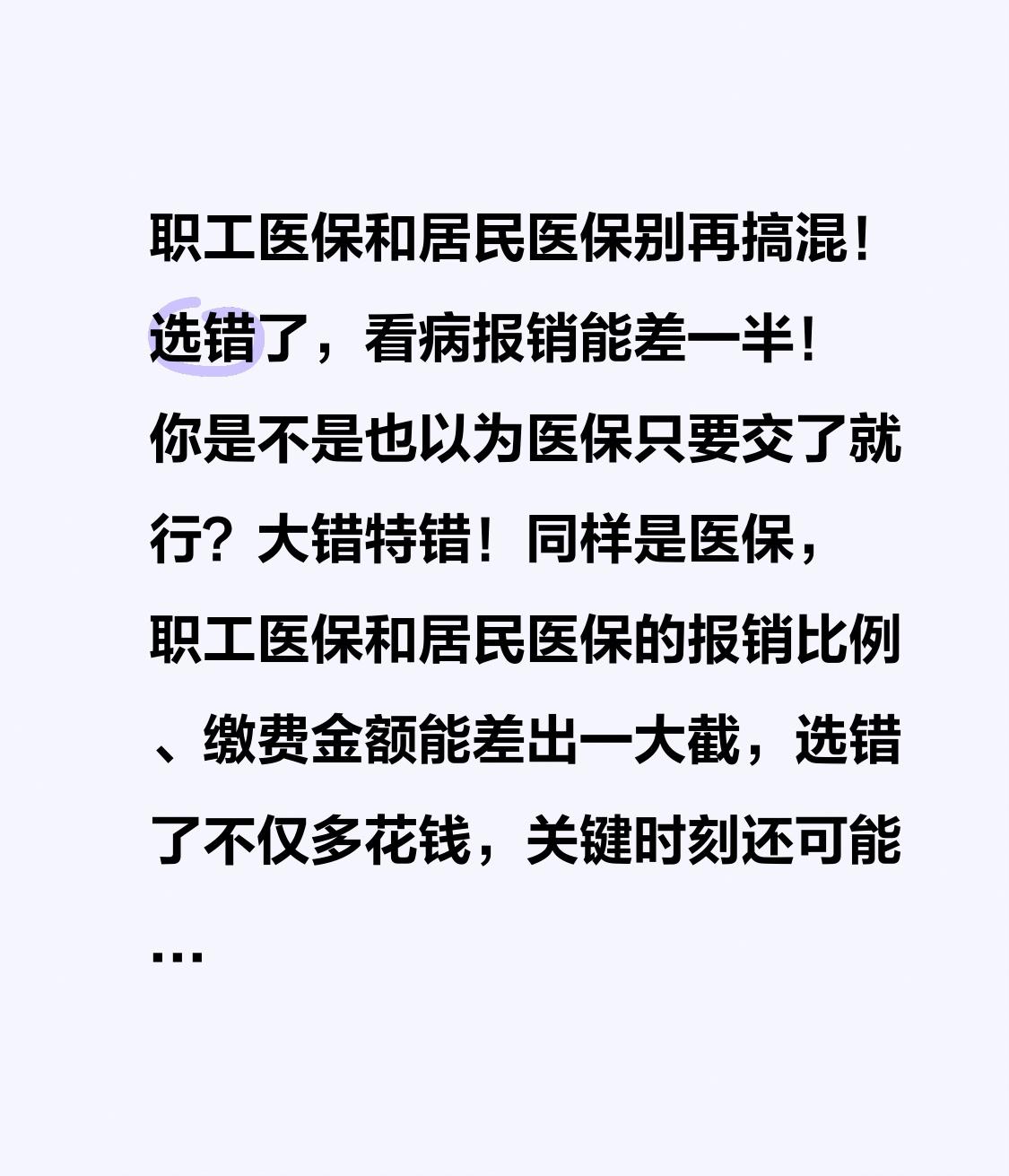 职工医保和居民医保别再搞混!选错了,看病报销能差一半! 你是不是也以为医保只要交了就行?大错特错!同样是医保,职工医保和居民医保的报销比例、缴费金额能差出一大截,选错了不仅多花钱,关键时刻还可能影响看病! 先说说大家最关心的缴费。职工医保是上班族的标配,由公司和个人共同承担,每月从工资里自动扣除,缴费金额和工资挂钩,缴满一定年限,退休后就能终身享受医保待遇。居民医保就不一样了,它面向的是没有工作的老人、小孩、自由职业者,一年缴一次费,金额固定,几百块钱就能保一年,但没有终身医保这个说法,缴一年保一年,断缴就失效。 这里有个很多人都踩过的坑,也是关键的转折点:很多自由职业者觉得职工医保缴费高,就随便选了居民医保,结果真住院了才发现亏大了!就拿三甲医院住院来说,职工医保的报销比例能达到70%-90%,而居民医保大多只有50%-70%,花10万看病,职工医保能报七八万,居民医保可能只报四五万,这中间的差价可不是小数目!而且职工医保有个人账户,每月会返钱到医保卡,能直接去药店买药、付门诊费;居民医保没有个人账户,卡里没钱,门诊报销门槛还高。 还有人觉得,我身体好,交居民医保就够了。但你别忘了,职工医保除了报销比例高,还能享受更多福利,比如大病保险的起付线更低,报销上限更高,遇到重大疾病时,能大大减轻负担。而居民医保虽然便宜,保障力度确实要弱一些,更适合预算有限、身体状况较好的人群。 说到底,医保没有好坏之分,只有适不适合。上班族没得选,职工医保是标配;没工作的朋友,根据自己的经济情况和健康状况挑就行。但千万别稀里糊涂跟风交,不然真到用钱的时候,哭都来不及! 我们交医保,图的就是一份踏实,一份生病时不用愁钱的底气。希望大家都能选对适合自己的医保,健健康康不用它,真要用时能扛事! 你是不是也在纠结选哪种医保?