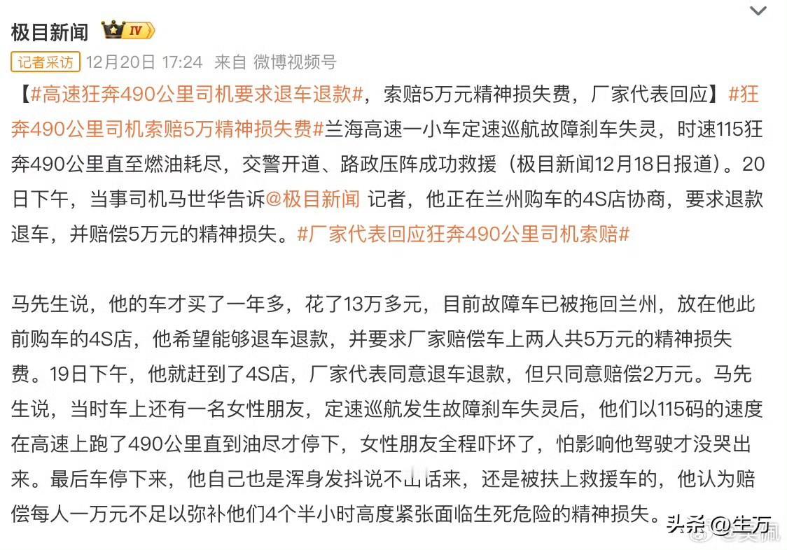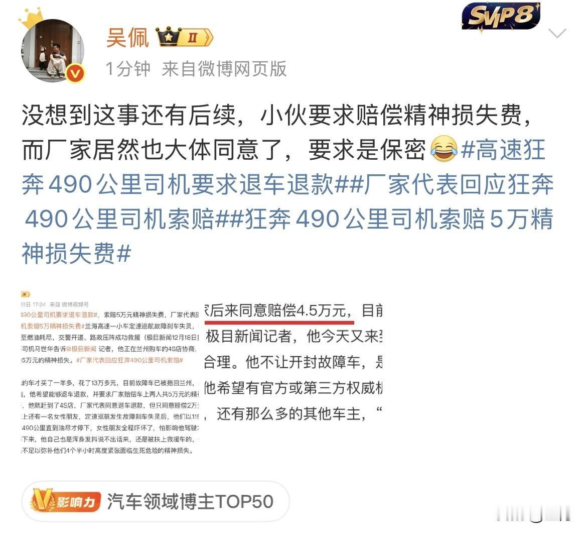 吴佩:高速狂奔这事儿还有后续,小伙要求赔偿4.5万,厂家疑似也同意了[捂脸]