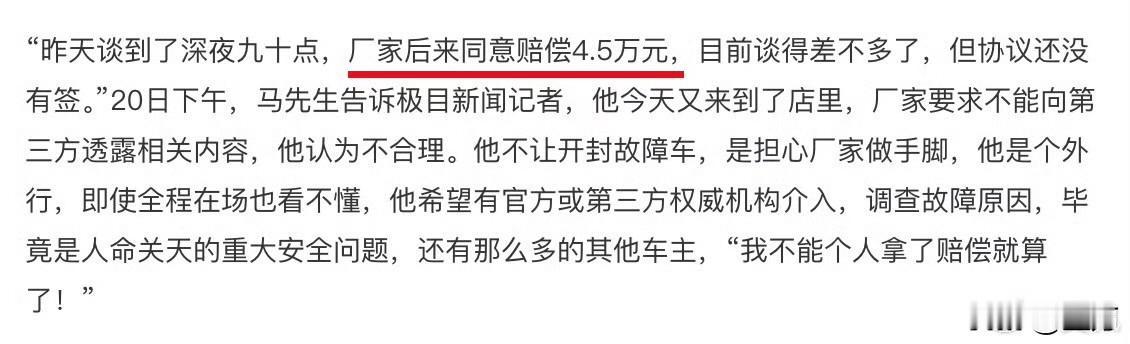吴佩:高速狂奔这事儿还有后续,小伙要求赔偿4.5万,厂家疑似也同意了[捂脸] 就在刚才,资深汽车博主吴佩,在社交网络上发出了这个事情最新的进展,没想到这个事情进展的出乎意料的顺利[捂脸] 因为仅仅过去了两天时间,这个事情就谈得差不多了,由于这个汽车品牌大家都已经知道了,属于一个比较大的牌子,所以这个小伙子在高速上开启这个车定速巡航的时候,出现这种情况,直至把燃油耗尽才停下来,但不幸中的万幸是他人没事。 所以这个事情再经过这两天的协商之后,小伙大概的意思就是要赔他一点钱,做为精神损失,虽然身体上没有什么伤害,但精神上他真的扛不住,同时估计还得给他把车弄好才行,从吴佩发出的消息来看,大概就是厂家都满足了这个小伙子的要求。 但是厂家也有一个小小的请求,就是不能够把这个事情对外说,可是小伙子不同意,毕竟他认为又不是啥见不得人的事儿,而且这个事情本来体就一直在追踪报道。 所以极目新闻就把这个事情的前因后果,以及最新进展全部都报道出来了 ,但最终这个事情会不会就因为赔四万多块钱,就完全了解了,目前还不能够确定。 所以这个事情应该还没有完全结束,到时候我们看看方便综合的信息结果出来,到底是怎么回事,毕竟如果最终的结果不是这个小伙子操作问题,而是车辆的问题,那么就有可能涉及到这个车型的安全问题,如果不仅仅只是他这一台车有这个问题,那这个事儿可能就不是这么简单了。