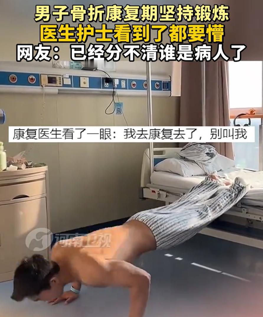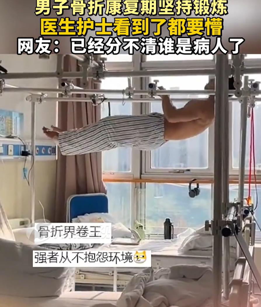 是个狠人!一男子因骨折住院康复,可等到医生和护士查房时,却发现男子已经用床上的栏杆锻炼了起来,不知道的还以为走进了健身馆,就连护士都感叹:一时间分不清谁才是病人了! 视频显示,男子是因为脚部骨折住院,按理说该躺着好好养伤,但却一点没有影响他锻炼身体,他双手抓着病床的护栏,把自己整个身子拉起来,一下一下地做着引体向上。脚上打着固定,上半身却一点没闲着,动作还挺熟练 对此,有网友佩服,说这就是自律的人,不管在哪儿,都能找到锻炼的方式,病床也拦不住 但也有网友质疑:难道锻炼就差这么几天了?这么高难度的动作,只要摔一下就老实了 这两种声音其实都能理解。不过更值得聊的点不在于他做了多难的动作,而是很多人对锻炼的误解。不少人把锻炼当成完整套餐,必须跑步、深蹲、器械齐全,少一样都不算数。这个男子的做法反而说明一件事,身体受限不等于完全躺平,只要避开受伤部位,训练并不是非黑即白 康复期真正的难点不是能不能动,而是会不会一动不动。长期卧床,肌肉流失、心肺下降都很快,等伤好了,人却虚了一圈。适度的上肢训练,对维持力量和精神状态确实有帮助,这也是不少康复方案里会强调的内容。前提只有一个,知道分寸,清楚风险 我倒是觉得,他明显对自己身体有判断,动作稳定,也没有逞强到全身参与。这和盲目折腾是两回事。真正危险的不是锻炼本身,而是不管自己处在什么阶段,都用同一套标准要求身体
