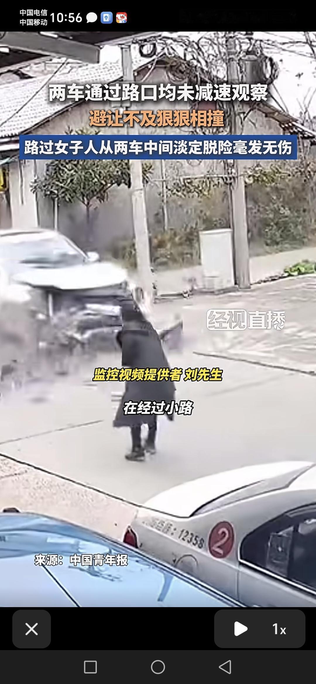 湖南桃原两辆小车在经过十字路口的时候都未认真观察路况,也没有减速,一名女子刚好从另外一个方向走过来差点就被撞上了,刚好那辆车相撞的时候及时的避开,女子毫发无损。不少看过视频的网友都觉得女子很幸运,很难想象,两辆车如果撞上了,后果该有多严重,所以不管是行车还是行人,都要注意交通安全。