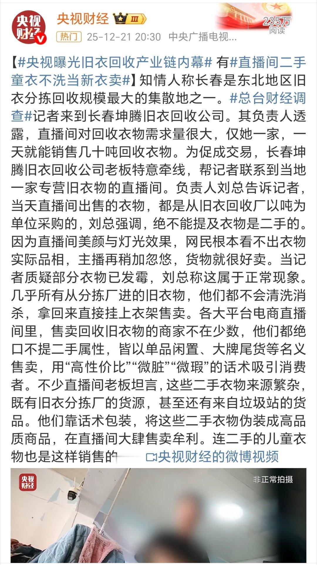 央视曝光旧衣回收产业划重点,“绝不能提及衣物是二手的。 因为直播间美颜与灯光效果,网民根本看不出衣物实际品相,主播再稍加忽悠,货物就很好卖。当记者质疑部分衣物已发霉,刘总称这属于正常现象。 几乎所有从分拣厂进的旧衣物,他们都不会清洗消杀,拿回来直接挂上衣架售卖。”这也太坑了吧怎么才能避坑呢?