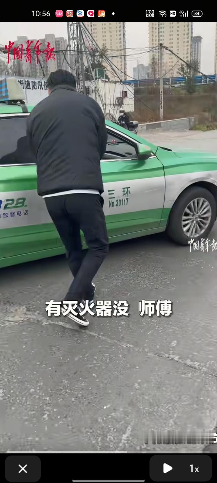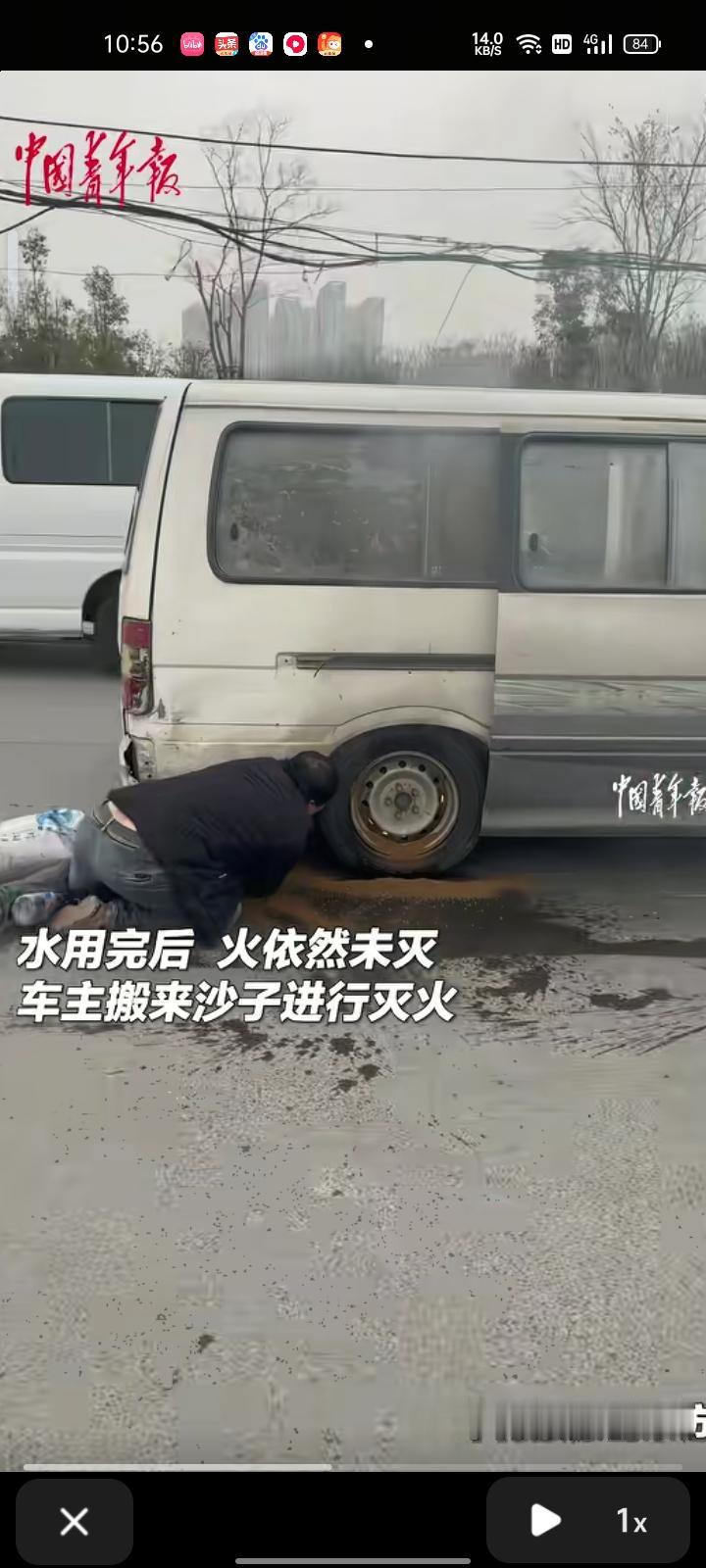 12月20日,河南郑州。男子开车遇到对向来车后轮胎起火,立即掉头追上去提醒,并下车帮忙灭火。水用完后火没灭,他又搬来沙子来灭火,随后问出租车司机要灭火器,才把火扑灭。