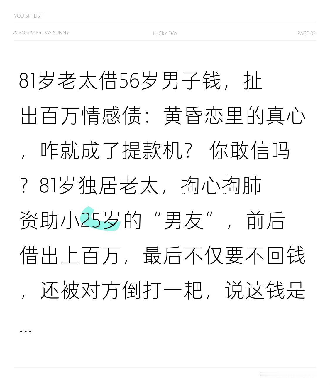 81岁老太借56岁男子钱,扯出百万情感债:黄昏恋里的真心,咋就成了提款机? 你敢信吗?81岁独居老太,掏心掏肺资助小25岁的“男友”,前后借出上百万,最后不仅要不回钱,还被对方倒打一耙,说这钱是“恋爱赠与”?这场黄昏恋背后的情感债,让无数网友看完怒了! 家住江苏的王老太(化名),老伴早逝,子女常年在外打拼,孤独的日子里,56岁的张某闯入了她的生活。张某嘴甜会来事,每天早晚问候,陪她聊天解闷,还主动帮着跑腿办事,把王老太照顾得无微不至。老人以为晚年终于遇上了真心人,对张某深信不疑。 没过多久,张某就开始频频“哭穷”:一会儿说儿子结婚要彩礼,一会儿说生意周转不开,甚至谎称自己重病急需手术费。王老太心疼“男友”,二话不说就掏钱,从几万到几十万,累计借出130多万,全是自己的养老钱。张某一开始还写过几张欠条,可后来就再也不提还款的事。 直到转折点出现:王老太身体不适需要用钱,向张某催要欠款时,他突然翻脸不认人!不仅拒绝还钱,还直言“这些钱是你自愿给我的,恋爱期间的赠与凭啥要还”。这下王老太才如梦初醒,自己掏心掏肺的付出,可能只是一场精心策划的骗局。 无奈之下,王老太只能起诉到法院。庭审时,张某拿不出任何“赠与”的证据,而王老太的转账记录、欠条和聊天记录,清晰证明了借贷关系。最终法院判决张某返还全部欠款,但他早已把钱挥霍一空,执行过程举步维艰。 其实这不是孤例,佛山一位69岁阿姨,被小16岁的男友骗走48万养老钱;青岛60岁女士,差点为“网络男友”贷款救急,幸被警方劝阻。这些案例背后,是无数老人对情感陪伴的渴望。数据显示,超过60%的独居老人,对情感陪伴的需求特别强烈,这也让骗子有了可乘之机。 他们打着“黄昏恋”的幌子,用甜言蜜语攻破老人的心理防线,再一步步套取养老钱。可老人要的从来不是多少钱的回报,只是一份知冷知热的陪伴,一份老有所依的安心。 真心不该被辜负,养老钱更不能成为骗子的目标。希望做子女的,多抽点时间陪伴父母;也提醒所有老人,黄昏恋虽美好,但涉及金钱一定要擦亮眼睛,借条、转账记录这些证据千万别少。