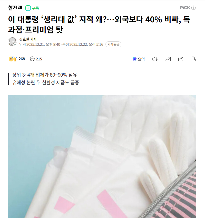 【报告揭示:韩国卫生巾价格高出海外四成,垄断与溢价是主因】海外新鲜事 热点现场 李在明总统19日在公平交易委员会、性别平等家族部业务报告中指示“韩国卫生巾比其他国家的贵”,要求调查其原因,由此,“卫生巾价格泡沫争议”再次成为焦点。李总统提及的卫生巾价格海外比较调查统计数据源自女性环境联合会在2023年“世界月经日”(5月28日)之际发布的《一次性卫生巾价格·广告监测报告》。女性环境联合会是一个自20世纪90年代后期起开展包括女性健康权在内的气候·性别正义运动的团体。女性环境联合会女性健康组长安玄真21日在与《韩民族日报》的电话采访中,就总统业务报告中出现卫生巾价格问题一事表示“首先表示欢迎”。她说道:“2016年‘鞋垫卫生巾’事件曝光时,有位地方议员曾发言说‘生理带(卫生巾)’这个词听起来不舒服,提议改为‘卫生带’,受到了批评。将近十年后的今天,总统率先提及卫生巾问题,我们首先对此表示欢迎。”2016年,一名女性青少年因卫生巾价格昂贵而使用鞋垫来应对的所谓“鞋垫卫生巾”事件曝光后,此前一直被忽视的“月经贫困”也成为了政策对象。安组长说:“‘鞋垫卫生巾’事件也是当时某卫生巾制造公司宣布涨价,女性及青少年们对此表示反对,并在社交网站上晒出卫生巾价格负担而开始的。”她还补充道:“因为我国没有最新的卫生巾价格统计,所以我们想自己制作,(在2023年)制作了价格监测报告。”当时该团体调查韩国513种卫生巾(包括护垫、卫生棉条、裤型卫生巾等)和11个国家(日本、新加坡、英国、法国、德国、意大利、西班牙、荷兰、加拿大、澳大利亚、美国)的69种卫生巾价格,结果显示,国内每片卫生巾平均价格比国外贵39.55%(195.56韩元)。韩国卫生巾为何昂贵?安组长认为“韩国卫生巾企业的垄断结构问题很大”,并指出“不能将卫生巾价格完全交由市场决定。需要政府进行卫生巾价格合理性调查等积极管理”。据推测,在卫生巾市场上,尤妮佳、LG生活健康等前3-4位的公司占据了约80-90%的市场份额。对于市场份额高的必需品,即使价格持续上涨,消费者也很难用其他产品替代,这是一个问题。根据韩国国家数据处理的品目别消费者物价指数,以今年第三季度为准,卫生巾消费者物价指数为118.48,比五年前的2020年上涨了18.48%。从2020年到今年第三季度,过去五年多的时间里,卫生巾消费者物价指数一直超过整体物价总指数。以至于在第21届、第22届国会中,接连提出了《月经用品价格稳定法》(增值税法·税收特例限制法修订案)。卫生巾价格争议是一个由来已久的老问题。2000年代初期,在韩国女性民友会等女性团体接连提出问题后,韩国政府也曾于2004年免除了卫生巾的附加价值税(10%)。安组长表示“即使免除了附加税,(卫生巾)消费价格仍然昂贵,这说明存在其他因素”。女性环境联合会指出,广告费支出、获取有机·环保等各种认证标志的费用等也是导致卫生巾价格上涨的原因。2017年卫生巾有害性问题引发公众讨论后,随着消费者对“安全性”的需求增大,标榜“有机”、“高级”等概念的产品系列急剧增加。女性环境联合会的调查结果显示,国内每片有机卫生巾的平均价格比非有机卫生巾贵26.56%(141.39韩元)。安组长批评道:“以必需品卫生巾的安全性为筹码抬高价格的行为是有问题的”,“特别是食品药品安全处每年调查月经用品的虚假·夸大广告,却不进行适当的行政处罚,导致连续三四年被查处的企业比比皆是”。昂贵的卫生巾价格也使得“月经贫困”成为社会问题。安组长说:“虽然正在实施针对低收入女性青少年的月经用品代金券支援项目,但仍然存在严格的收入标准、困难的使用方法、使用场所限制等诸多不足。”国会于2021年通过了包含青少年月经用品普遍给付依据的《青少年福祉支援法》修订案。女性环境联合会在该法通过后,针对满9-24岁的女性青少年进行了月经用品支援项目现状及案例调查,安组长表示“仍然有处于月经贫困盲区的青少年、青年”。她补充道:“在首尔城东区、釜山东区·北区等全国地方自治团体层面,正在通过条例扩大青少年月经用品普遍给付、公共场所免费卫生巾自动售货机设置,但政府政策仍局限于选择性支援,令人遗憾。”女性环境联合会自2017年将卫生巾安全性问题公众化,推动政府首次进行卫生巾健康影响调查以来,一直持续开展与月经相关的女性健康权运动。今年还发布了关于“绝经期(更年期)社会照料”的公众讨论基础资料。安组长表示“月经并非只是年轻女性的问题,但针对40-50岁女性的月经政策事实上处于缺失状态”,“政府不仅应制定卫生巾价格稳定政策,还应从国民健康权层面,制定关于月经的综合对策”。