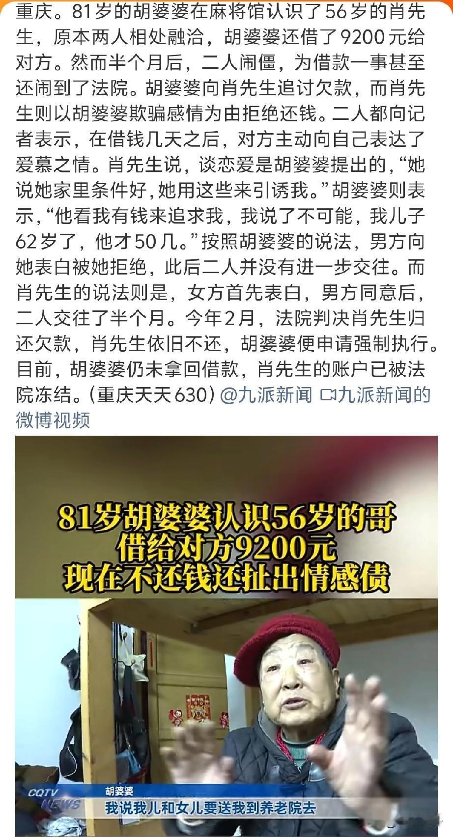 重庆81岁胡婆婆向56岁麻将馆牌友肖先生追讨9200元借款时,男方以“被欺骗感情”为由拒还,法院判决后仍拒不执行,最终账户被冻结。 81岁老太借钱给56岁大叔,本以为只是简单借个钱,没想到还扯出情感小秘密。这年龄差都能组“忘年CP”咯!胡婆婆在事后表示“自责”和“没考虑周全”,这提醒我们,尤其是老年人,在出借款项时需格外谨慎。 老年人在借款前最好与子女或信任的亲友商量,不要因为不好意思而草率决定。同时,要注意保留借款凭证,如转账记录、借条等,以便在发生纠纷时维护自身权益。
