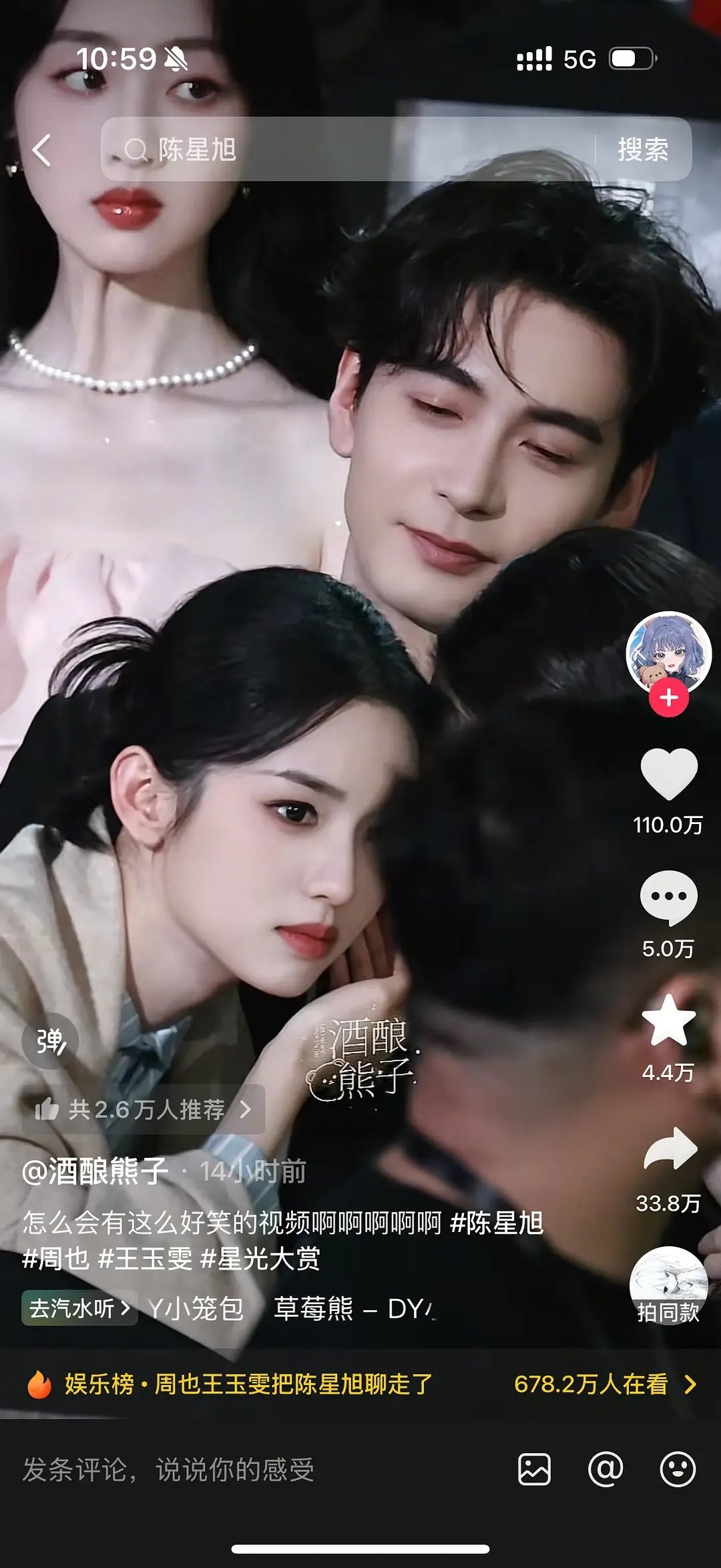 周也、王玉雯、陈星旭、这个在星光大赏聊天视频,昨天挺出圈的,已经破百万赞了,是我刷到的第一个百万视频。