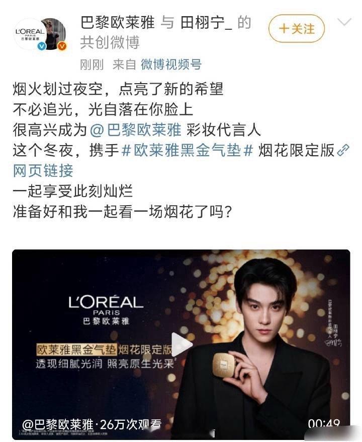 田栩宁田栩宁官宣成为巴黎欧莱雅彩妆代言人