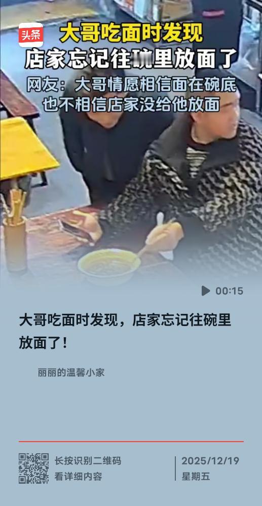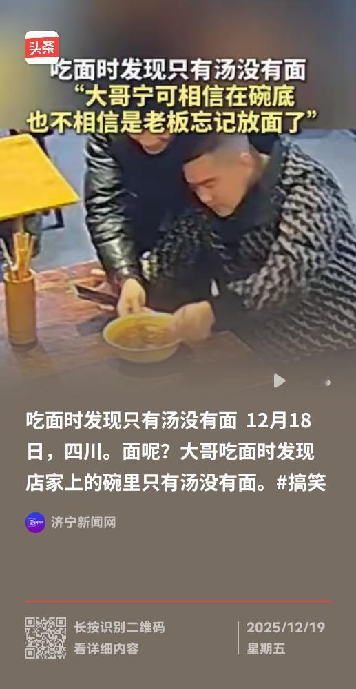 大哥吃面时发现碗里只有汤没有面,这一幕看似荒诞,却深藏着生活的无奈与温暖。你是否也曾在某个瞬间,像他一样,陷入过这样的尴尬?明明期待着一碗热腾腾的面,却只剩下清汤在碗中晃荡。有人会觉得失望,有人会笑着调侃自己“被套路”,但其实,这背后隐藏的,是我们对生活那份微妙的期待与现实的差距。 或许,那碗“空碗”代表的不只是一顿饭,更是一种人生的隐喻。我们每天奔波,为了理想、为了家庭、为了生活,拼尽全力,却常常发现,期待中的“面”变成了“汤”,或者说,梦想变得比想象中更简单、更淡然。这是不是每个人都曾经历的“空碗时刻”?那种突然醒悟、重新审视自己的瞬间。 但更令人感动的是,面对“没有面”的尴尬,大哥没有抱怨,没有失落,他反而笑了——也许,他懂得了生活的真谛:不在于碗里有没有“面”,而在于我们怎么面对“空”的那一刻。正是这些“空”,让我们更懂得珍惜“有”,更懂得用心去感受每一份平凡中的温暖。 这不禁让人反思:在这个快节奏的时代,我们是不是也太在意“有”了?其实,生活的美好,或许就藏在那些“空碗”的瞬间。我们要学会在“空”中找到“满”,在平凡中发现不平凡的意义。因为,人生不就是一碗汤,偶尔没有面,但只要心中有温暖,依然可以品味出生活的醇香。