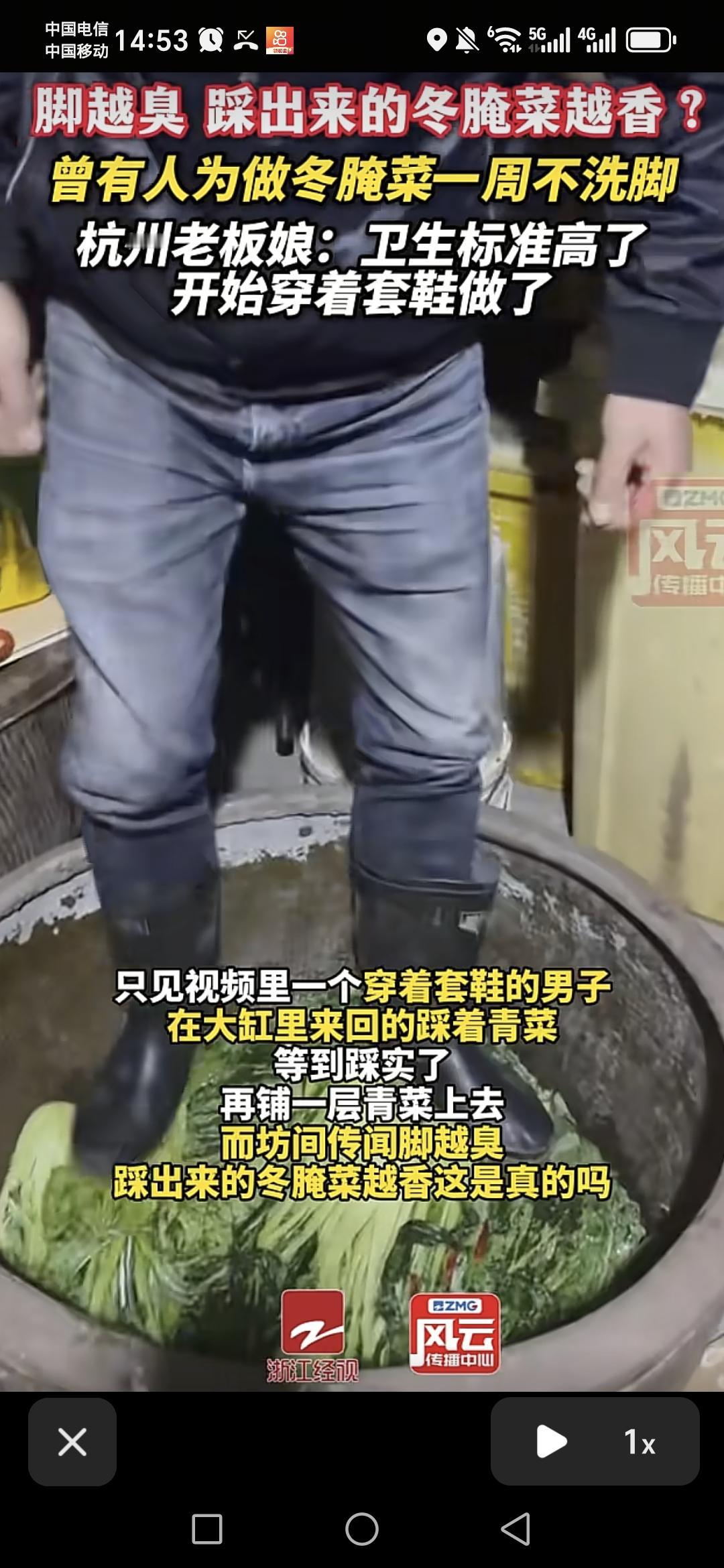 杭州余杭区一位农庄的老板娘分享了一段人穿着鞋靴在冬菜上不断踩压的视频,网友们炒翻了天。坊间传闻,腌制冬菜的时候,人是赤脚的,而且脚越臭,腌出来的冬菜就越好吃。老板娘回应了,这一说法,在以前人们都是赤脚的因为不穿鞋的话,不容易把菜叶子踩碎,而且光着脚,力度就刚刚好。野菜刚好贴合,所以腌出来的菜就更好吃。有专家表示腌冬菜好不好吃,事实上吃的都是冬菜表面的乳酸菌,而人体上的一些菌落也不会与菜的细菌切合,所以腌冬菜与穿不穿鞋是没有直接的关系。