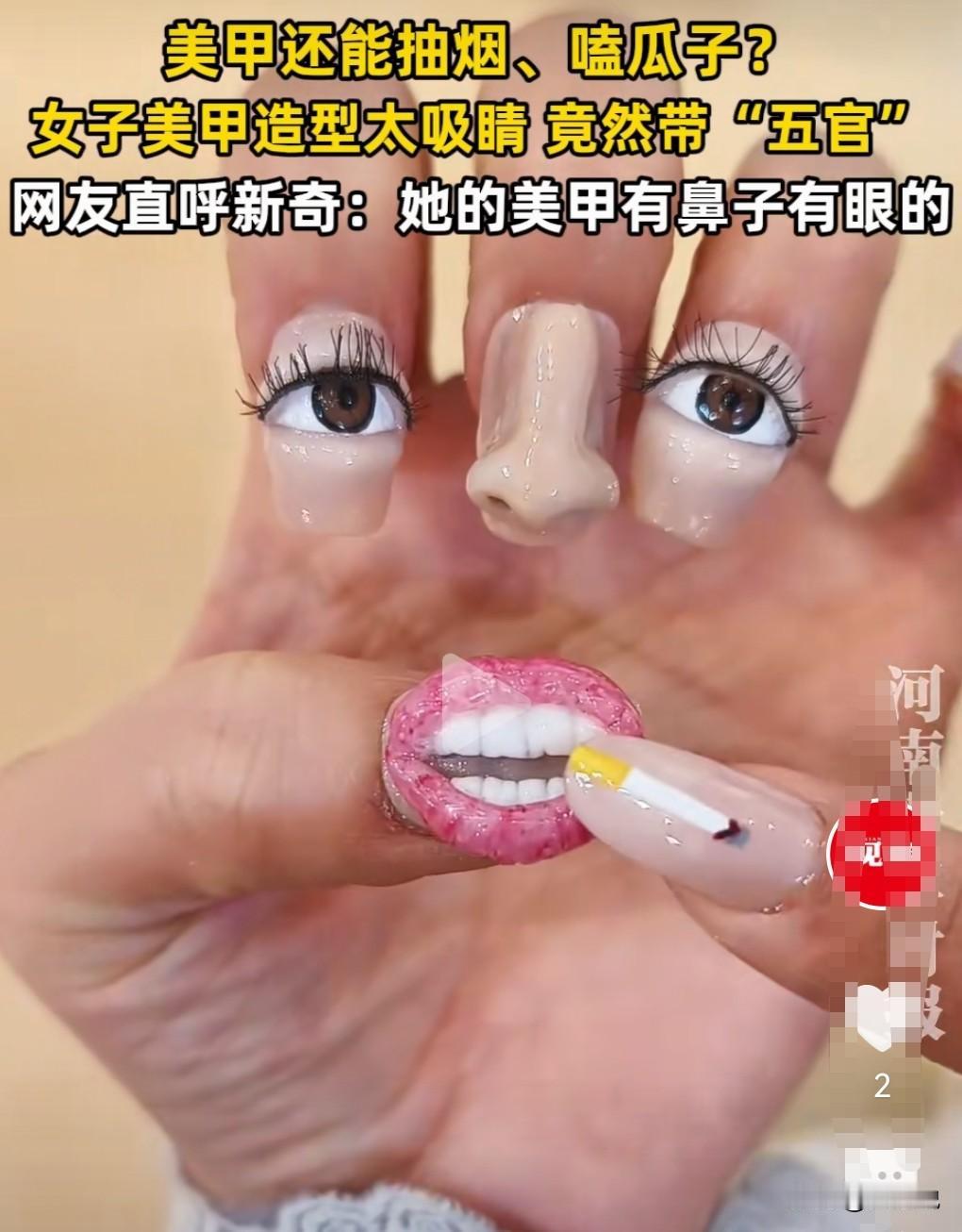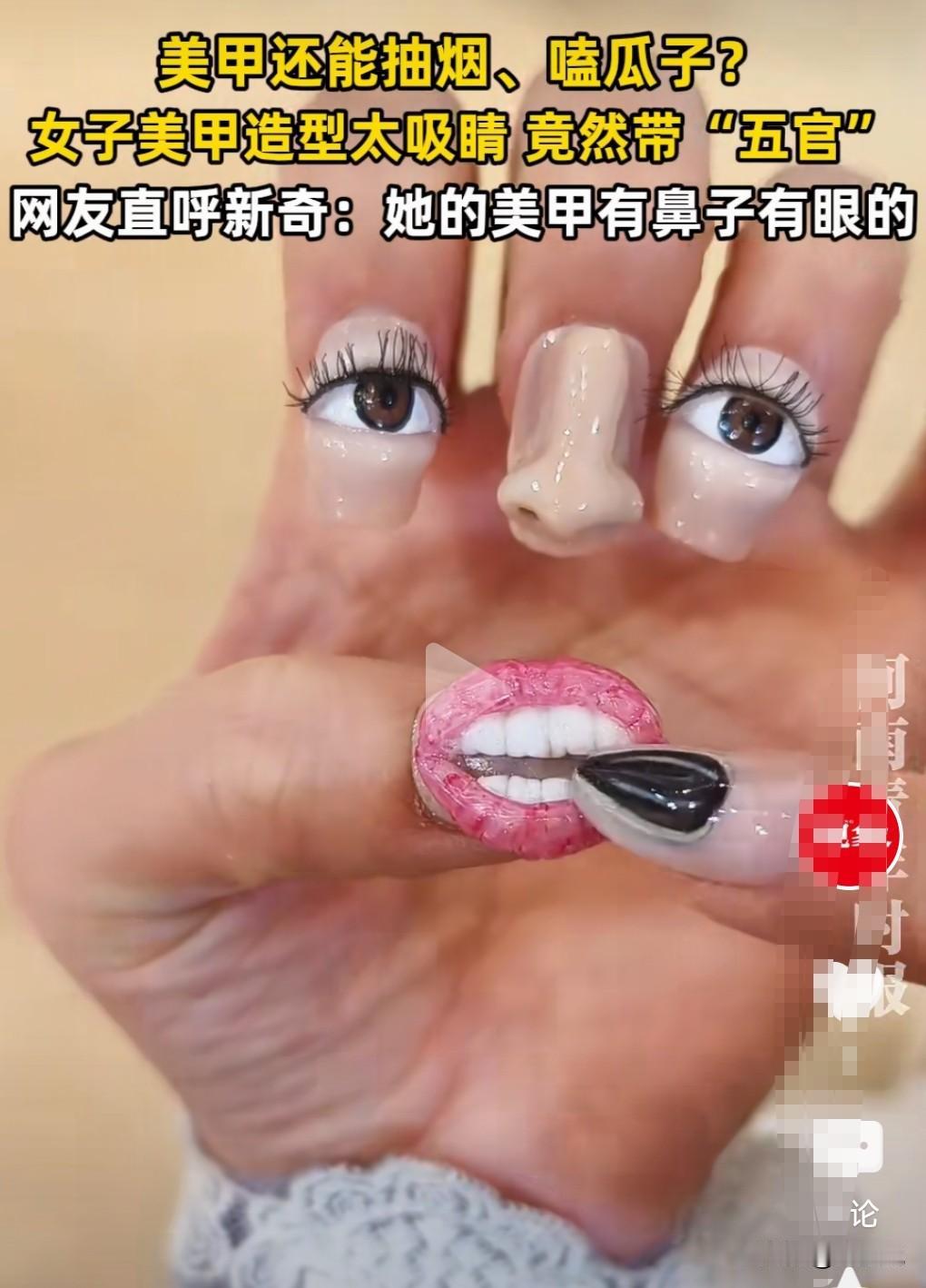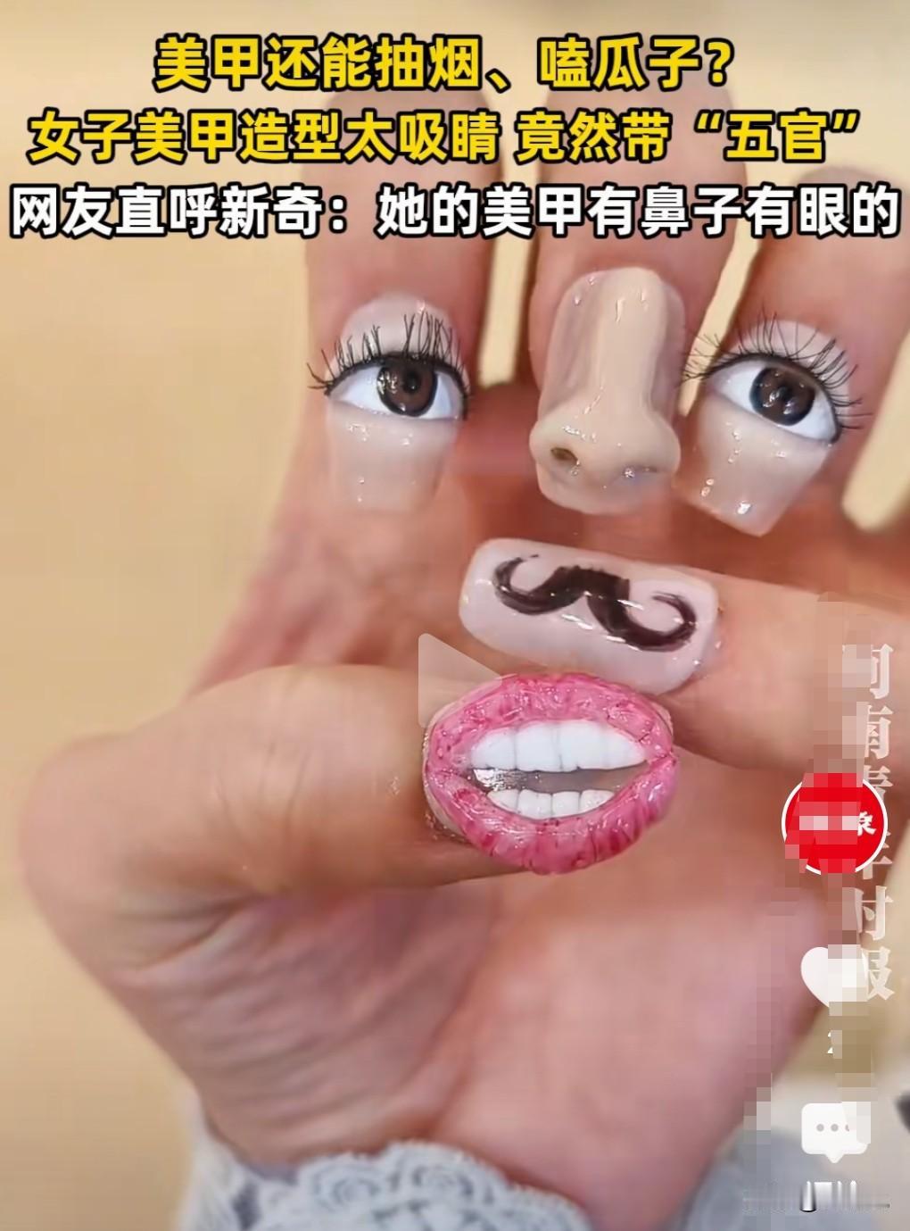 这真是脑洞大开呀。 想不到现在的美甲行业已经进化到这样的地步了。 这真的是很有乐趣啊。 可以弄那些抽烟、嗑瓜子,唱k的美甲等。 这真是长见识了。 现在的商家太会玩了,太有头脑了。